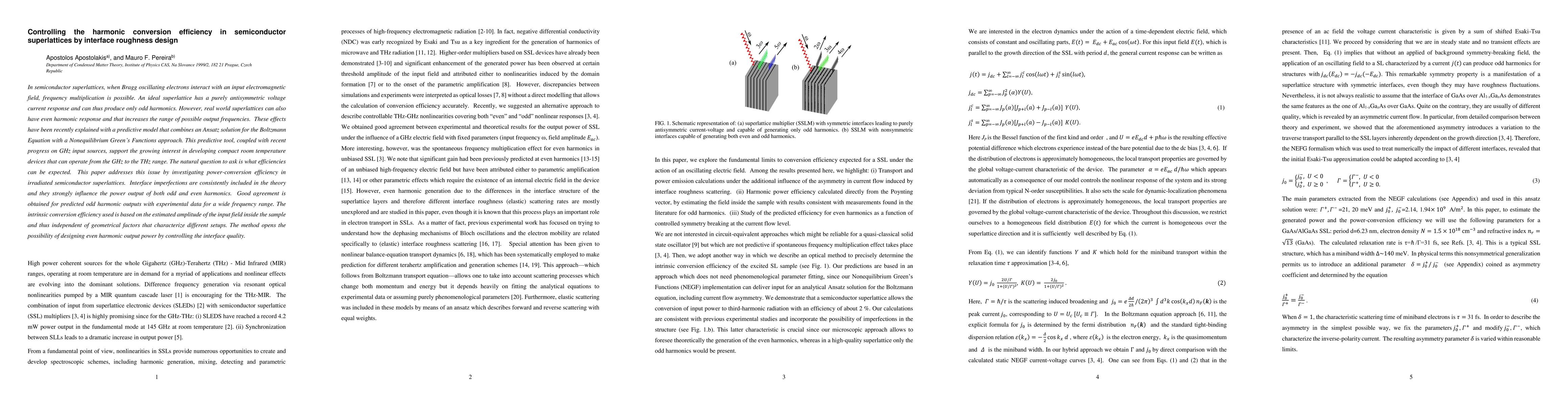 In semiconductor superlattices, when Bragg oscillating electrons interact with an input electromagnetic field, frequency multiplication is possible. An ideal superlattice has a purely antisymmetric voltage current response and can thus produce only odd harmonics. However, real world superlattices can also have even harmonic response and that increases the range of possible output frequencies. These effects have been recently explained with a predictive model that combines an Ansatz solution for the Boltzmann Equation with a Nonequilibrium Green's Functions approach. This predictive tool, coupled with recent progress on GHz input sources, support the growing interest in developing compact room temperature devices that can operate from the GHz to the THz range. The natural question to ask is what efficiencies can be expected. This paper addresses this issue by investigating power-conversion efficiency in irradiated semiconductor superlattices. Interface imperfections are consistently included in the theory and they strongly influence the power output of both odd and even harmonics. Good agreement is obtained for predicted odd harmonic outputs with experimental data for a wide frequency range. The intrinsic conversion efficiency used is based on the estimated amplitude of the input field inside the sample and thus independent of geometrical factors that characterize different setups. The method opens the possibility of designing even harmonic output power by controlling the interface quality.