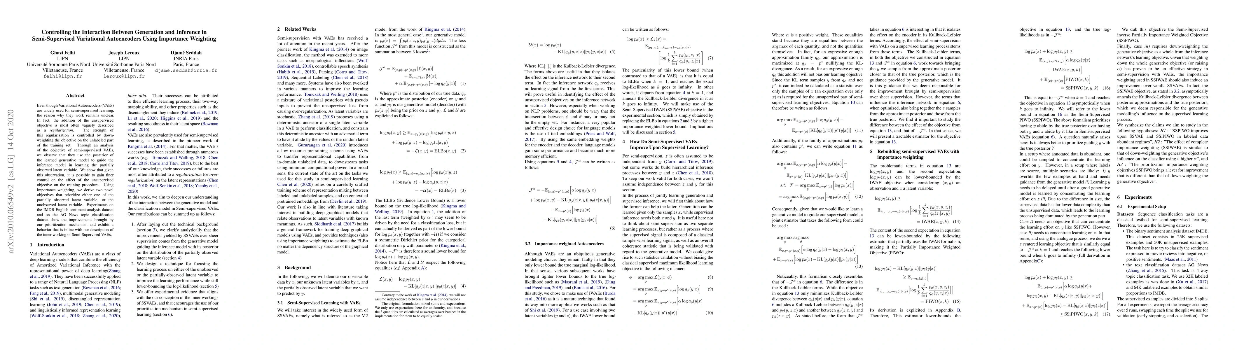 This paper explores the interaction between generation and inference in semi-supervised Variational Autoencoders (VAEs) and proposes using importance weighting to control the effect of the unsupervised objective. Experiments show improved performance on sentiment analysis and topic classification datasets.