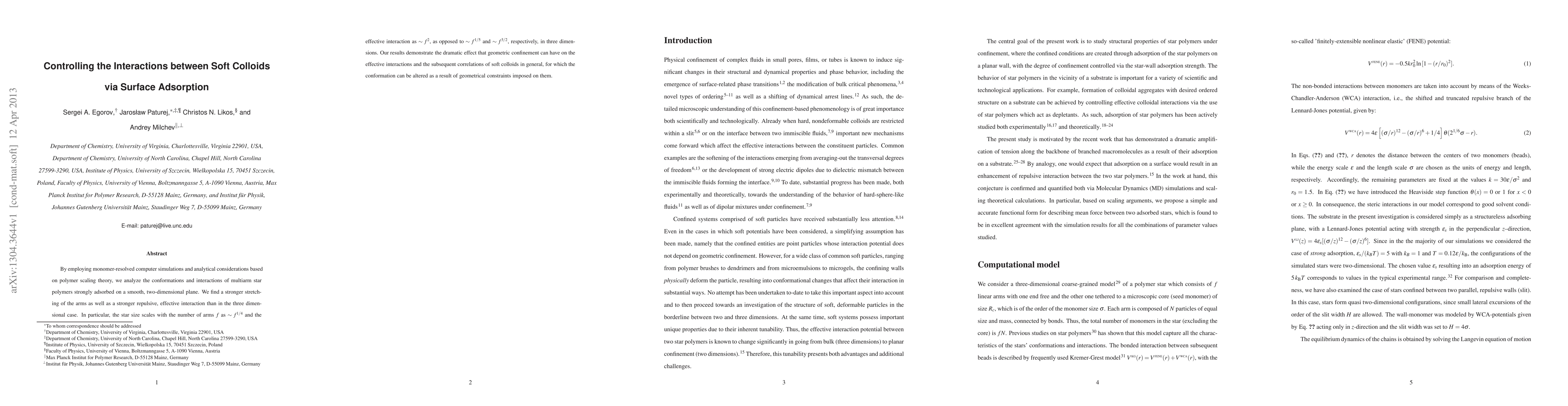 Researchers studied how adsorption on a plane affects soft colloids, finding stronger stretching and repulsive interactions in 2D compared to 3D, with the star size scaling with the number of arms.