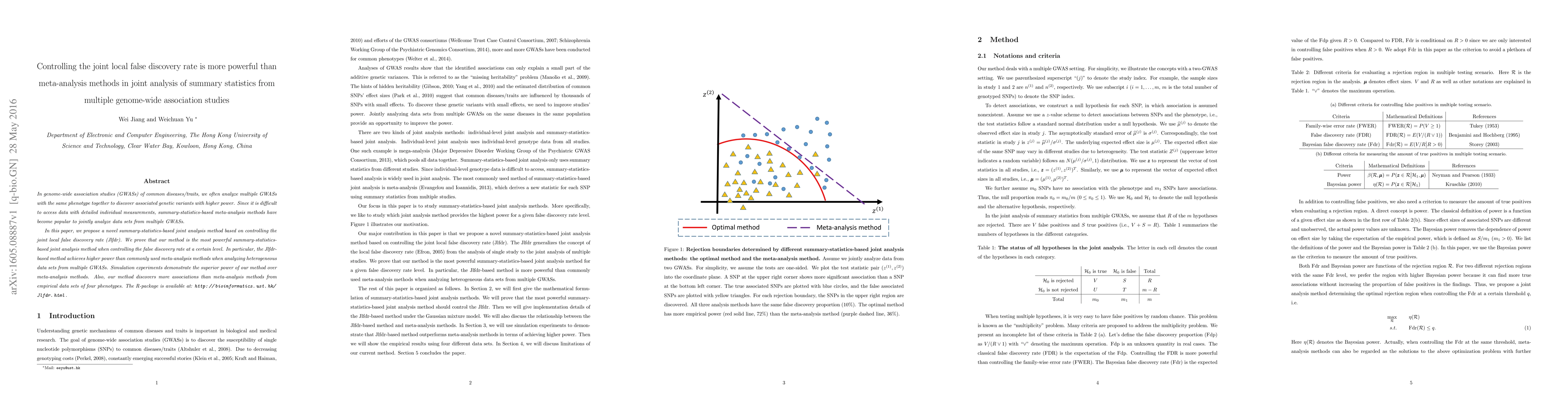 This paper proposes a novel joint analysis method based on controlling the joint local false discovery rate (Jlfdr) for summary statistics from multiple genome-wide association studies (GWASs). The method demonstrates superior power compared to traditional meta-analysis methods, as shown through simulation and empirical data analysis.