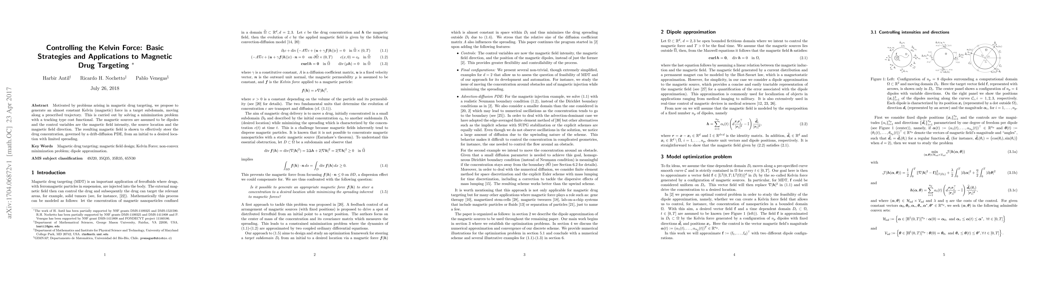 Motivated by problems arising in magnetic drug targeting, we propose to generate an almost constant Kelvin (magnetic) force in a target subdomain, moving along a prescribed trajectory. This is carried out by solving a minimization problem with a tracking type cost functional. The magnetic sources are assumed to be dipoles and the control variables are the magnetic field intensity, the source location and the magnetic field direction. The resulting magnetic field is shown to effectively steer the drug concentration, governed by a drift-diffusion PDE, from an initial to a desired location with limited spreading.