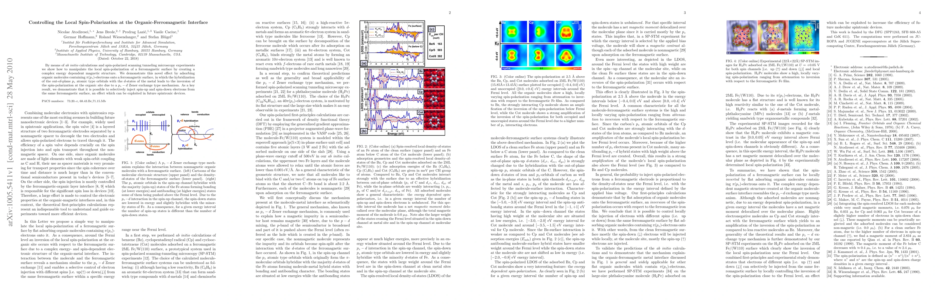 This research demonstrates how organic molecules with pi(pz)-electrons can manipulate local spin-polarization at the organic-ferromagnetic interface via a pz-d Zener exchange mechanism, enabling selective injection of spin-polarized electrons from a single ferromagnetic surface, potentially advancing spintronic technology.