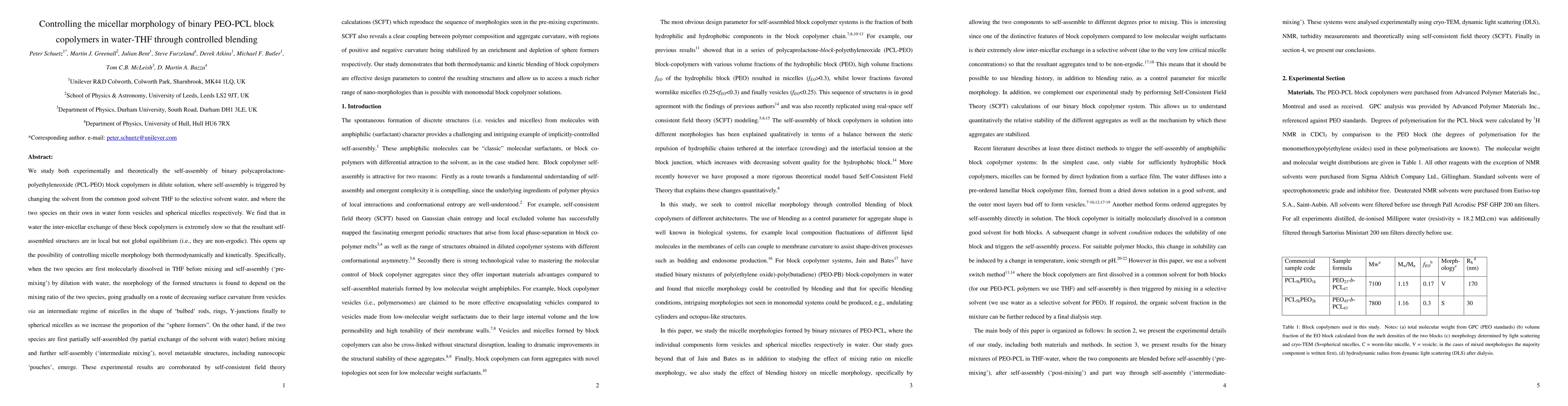 We study both experimentally and theoretically the self-assembly of binary block copolymers in dilute solution, where self-assembly is triggered by changing the solvent from the common good solvent THF to the selective solvent water, and where the two species on their own in water form vesicles and spherical micelles respectively. We find that in water the inter-micellar exchange of these block copolymers is very slow so that the self-assembled structures are in local but not global equilibrium (i.e., they are non-ergodic). This opens up the possibility of controlling micelle morphology both thermodynamically and kinetically. Specifically, when the two species are first dissolved in THF before mixing and self-assembly (`premixing') by dilution with water, the morphology is found to depend on the mixing ratio of the two species, going gradually from vesicles via `bulbed' rods, rings, Y-junctions and finally to spherical micelles as we increase the proportion of the sphere-formers. On the other hand, if the two species are first partially self-assembled (by partial exchange of the solvent with water) before mixing and further self-assembly (`intermediate mixing'), novel metastable structures, including nanoscopic pouches, emerge. These experimental results are corroborated by self-consistent field theory calculations (SCFT) which reproduce the sequence of morphologies seen in the pre-mixing experiments. SCFT also reveals a clear coupling between polymer composition and aggregate curvature, with regions of positive and negative curvature being stabilized by an enrichment and depletion of sphere formers respectively. Our study demonstrates that both thermodynamic and kinetic blending of block copolymers are effective design parameters to control the resulting structures and allow us to access a much richer range of nano-morphologies than is possible with monomodal block copolymer solutions.