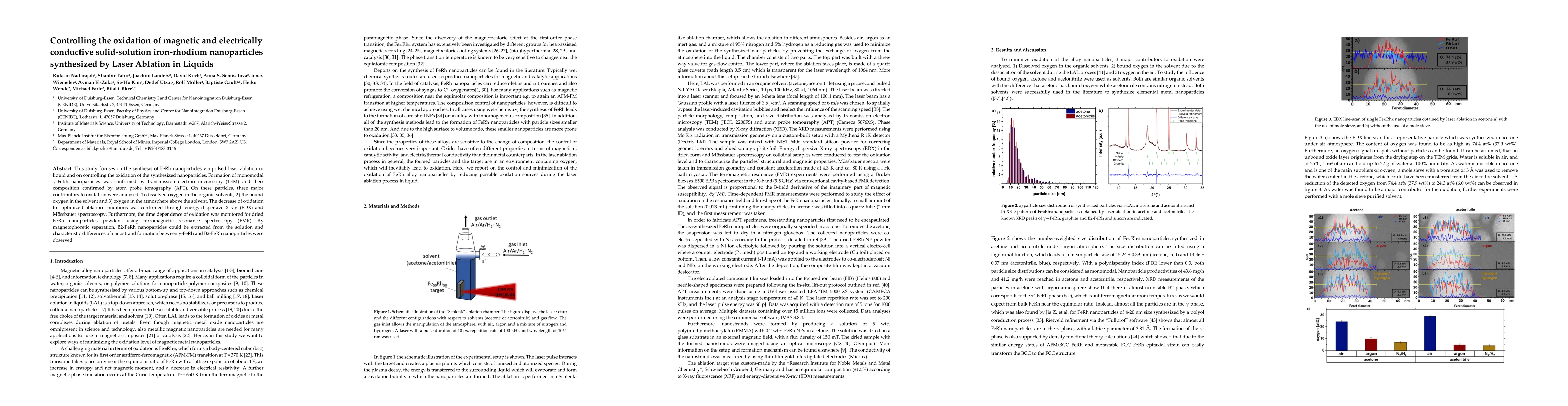 This study synthesizes FeRh nanoparticles using laser ablation in liquids and investigates methods to control their oxidation, confirming monomodal γ-FeRh formation via TEM and APT. Oxidation factors and time dependence were analyzed, showing reduced oxidation under optimized conditions.