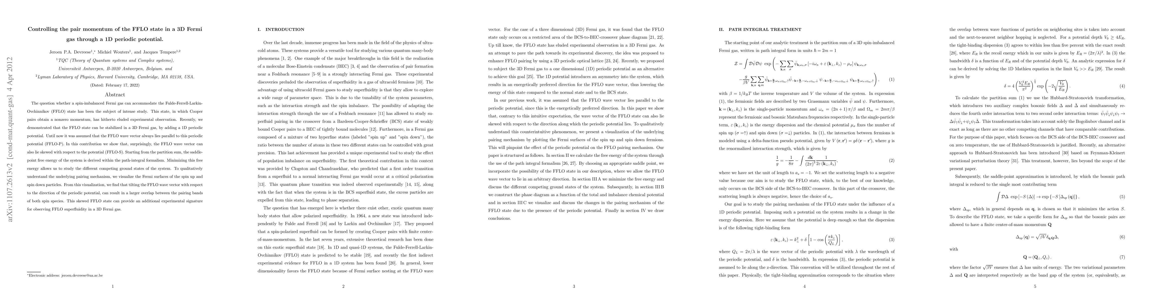 The question whether a spin-imbalanced Fermi gas can accommodate the Fulde-Ferrell-Larkin-Ovchinnikov (FFLO) state has been the subject of intense study. This state, in which Cooper pairs obtain a nonzero momentum, has hitherto eluded experimental observation. Recently, we demonstrated that the FFLO state can be stabilized in a 3D Fermi gas, by adding a 1D periodic potential. Until now it was assumed that the FFLO wave vector always lies parallel to this periodic potential (FFLO-P). In this contribution we show that, surprisingly, the FFLO wave vector can also lie skewed with respect to the potential (FFLO-S). Starting from the partition sum, the saddle-point free energy of the system is derived within the path-integral formalism. Minimizing this free energy allows us to study the different competing ground states of the system. To qualitatively understand the underlying pairing mechanism, we visualize the Fermi surfaces of the spin up and spin down particles. From this visualization, we find that tilting the FFLO wave vector with respect to the direction of the periodic potential, can result in a larger overlap between the pairing bands of both spin species. This skewed FFLO state can provide an additional experimental signature for observing FFLO superfluidity in a 3D Fermi gas.