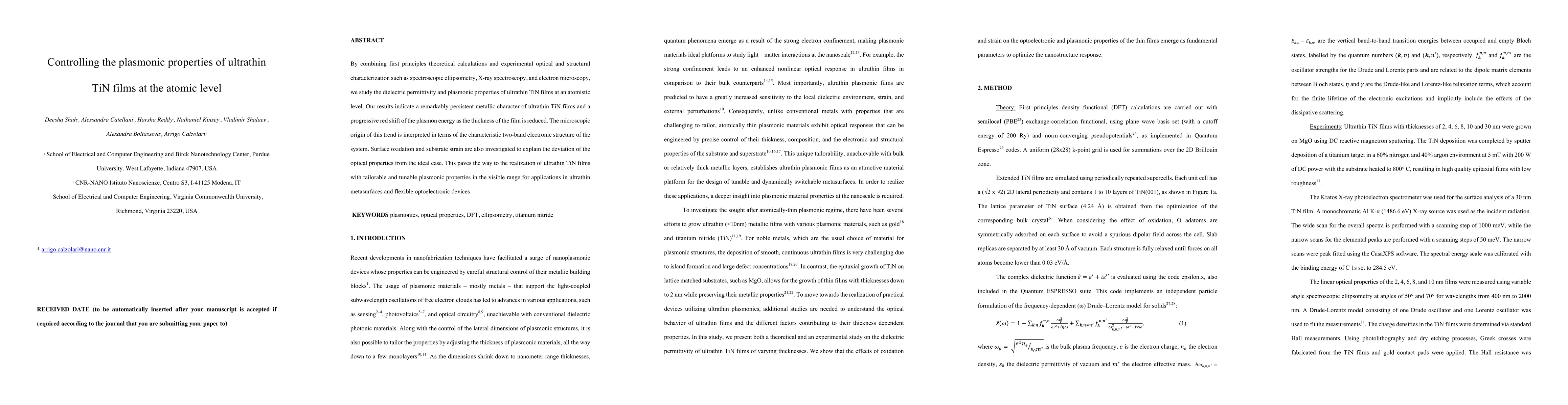 This study combines theoretical calculations and experimental characterization to explore the dielectric and plasmonic properties of ultrathin TiN films at an atomic level, revealing a persistent metallic character and a red shift in plasmon energy with decreasing film thickness due to the system's two-band electronic structure. The research also investigates surface oxidation and substrate strain to explain deviations in optical properties, paving the way for tunable plasmonic applications in metasurfaces and optoelectronics.