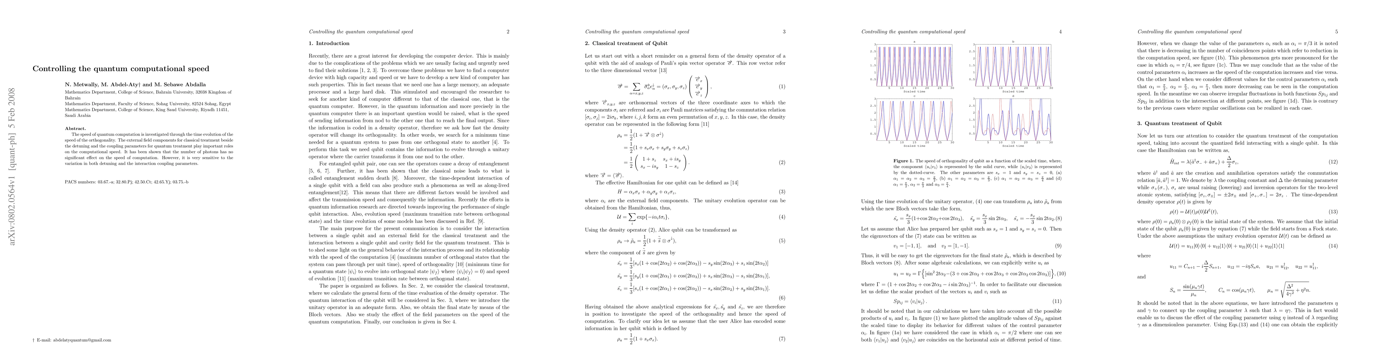 The speed of quantum computation is investigated through the time evolution of the speed of the orthogonality. The external field components for classical treatment beside the detuning and the coupling parameters for quantum treatment play important roles on the computational speed. It has been shown that the number of photons has no significant effect on the speed of computation. However, it is very sensitive to the variation in both detuning and the interaction coupling parameters.
