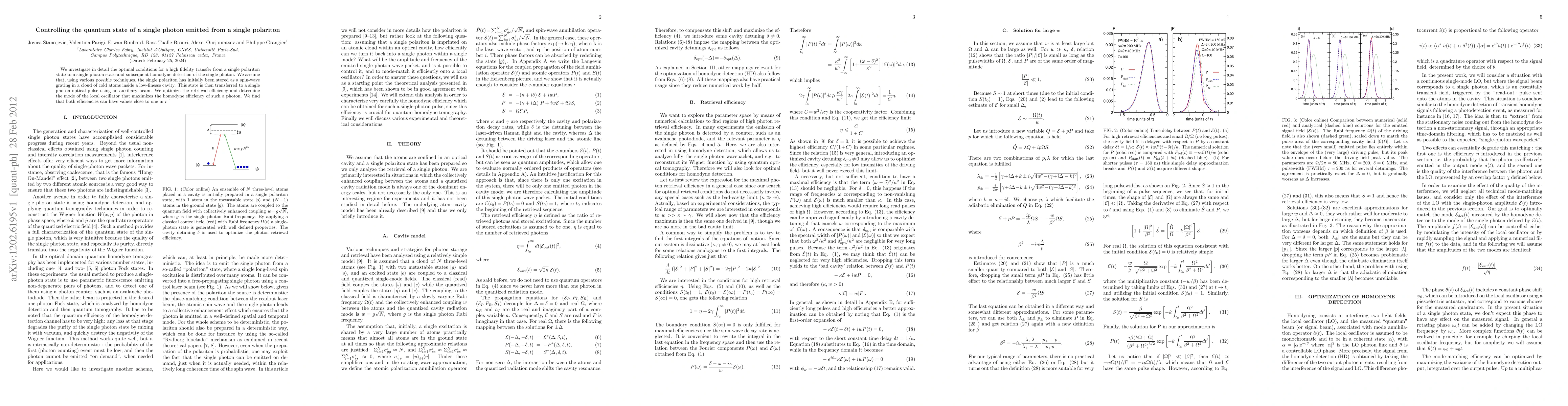 We investigate in detail the optimal conditions for a high fidelity transfer from a single-polariton state to a single-photon state and subsequent homodyne detection of the single photon. We assume that, using various possible techniques, the single polariton has initially been stored as a spin-wave grating in a cloud of cold atoms inside a low-finesse cavity. This state is then transferred to a single-photon optical pulse using an auxiliary beam. We optimize the retrieval efficiency and determine the mode of the local oscillator that maximizes the homodyne efficiency of such a photon. We find that both efficiencies can have values close to one in a large region of experimental parameters.
