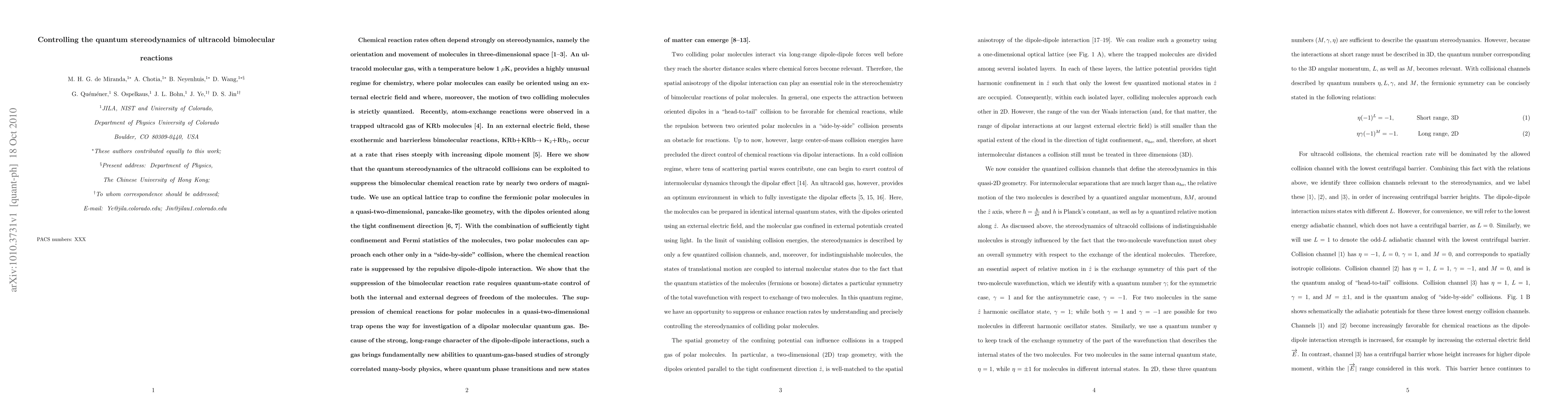 This paper demonstrates how quantum stereodynamics in ultracold bimolecular reactions can be controlled to suppress reaction rates by nearly two orders of magnitude using an optical lattice trap. The study reveals that confining polar molecules in a quasi-two-dimensional geometry suppresses the reaction rate due to repulsive dipole-dipole interactions, paving the way for new studies in dipolar molecular quantum gases and strongly correlated many-body physics.