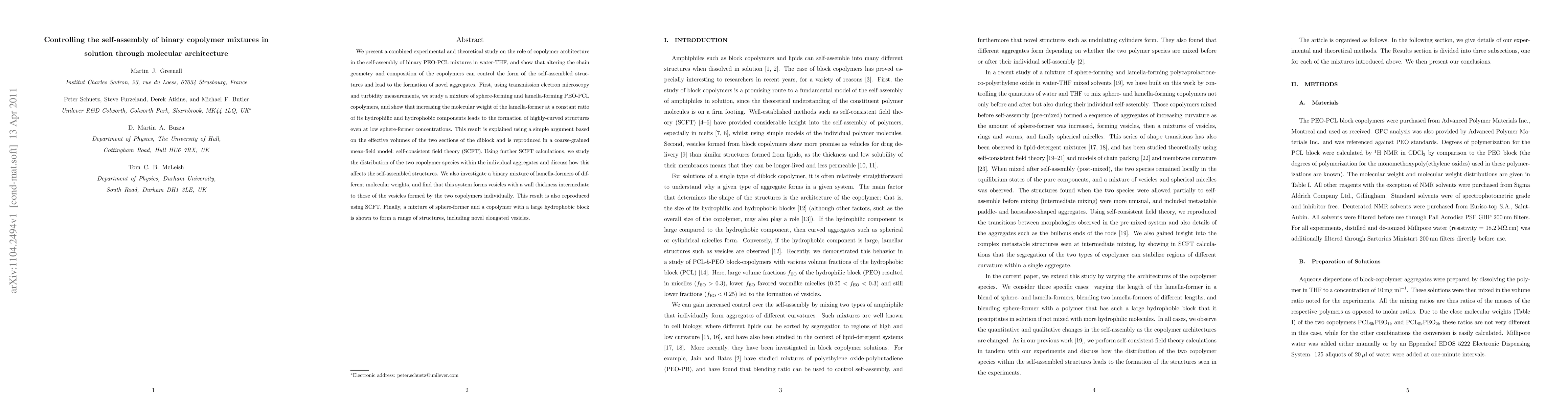 Researchers studied how changing copolymer architecture in water-THF can control self-assembled structures in binary mixtures, leading to novel aggregates with varying shapes.