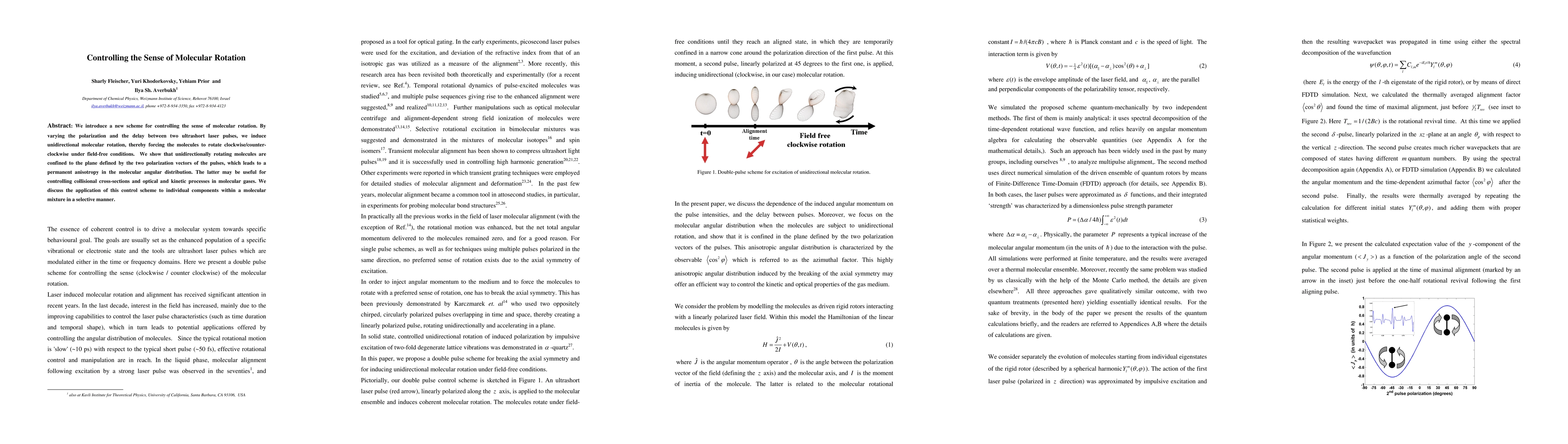 We introduce a new scheme for controlling the sense of molecular rotation. By varying the polarization and the delay between two ultrashort laser pulses, we induce unidirectional molecular rotation, thereby forcing the molecules to rotate clockwise/counterclockwise under field-free conditions. We show that unidirectionally rotating molecules are confined to the plane defined by the two polarization vectors of the pulses, which leads to a permanent anisotropy in the molecular angular distribution. The latter may be useful for controlling collisional cross-sections and optical and kinetic processes in molecular gases. We discuss the application of this control scheme to individual components within a molecular mixture in a selective manner.