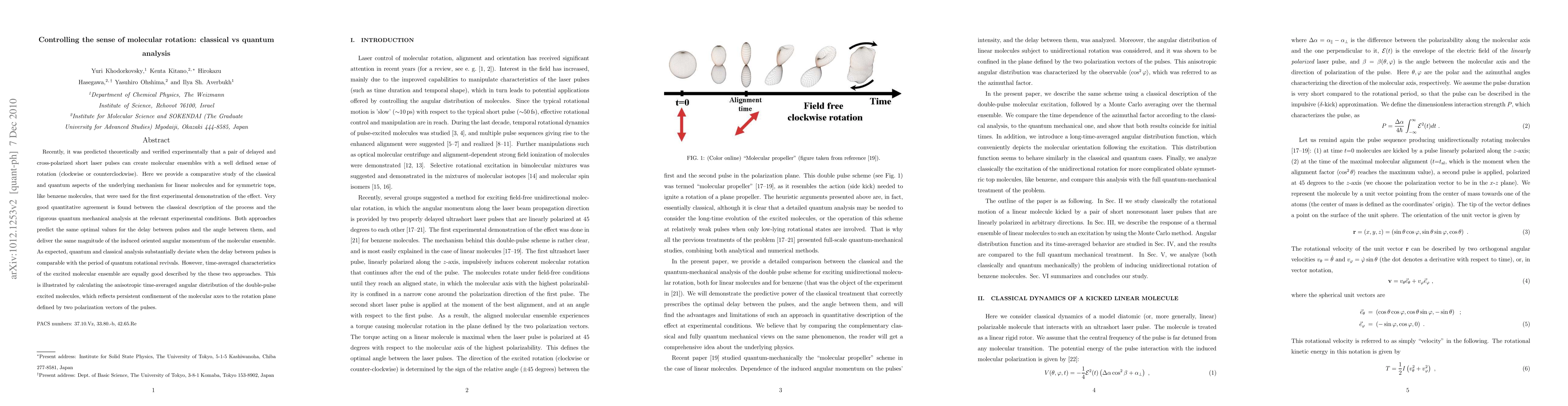 Recently, it was predicted theoretically and verified experimentally that a pair of delayed and cross-polarized short laser pulses can create molecular ensembles with a well defined sense of rotation (clockwise or counterclockwise). Here we provide a comparative study of the classical and quantum aspects of the underlying mechanism for linear molecules and for symmetric tops, like benzene molecules, that were used for the first experimental demonstration of the effect. Very good quantitative agreement is found between the classical description of the process and the rigorous quantum mechanical analysis at the relevant experimental conditions. Both approaches predict the same optimal values for the delay between pulses and the angle between them, and deliver the same magnitude of the induced oriented angular momentum of the molecular ensemble. As expected, quantum and classical analysis substantially deviate when the delay between pulses is comparable with the period of quantum rotational revivals. However, time-averaged characteristics of the excited molecular ensemble are equally good described by the these two approaches. This is illustrated by calculating the anisotropic time-averaged angular distribution of the double-pulse excited molecules, which reflects persistent confinement of the molecular axes to the rotation plane defined by two polarization vectors of the pulses.