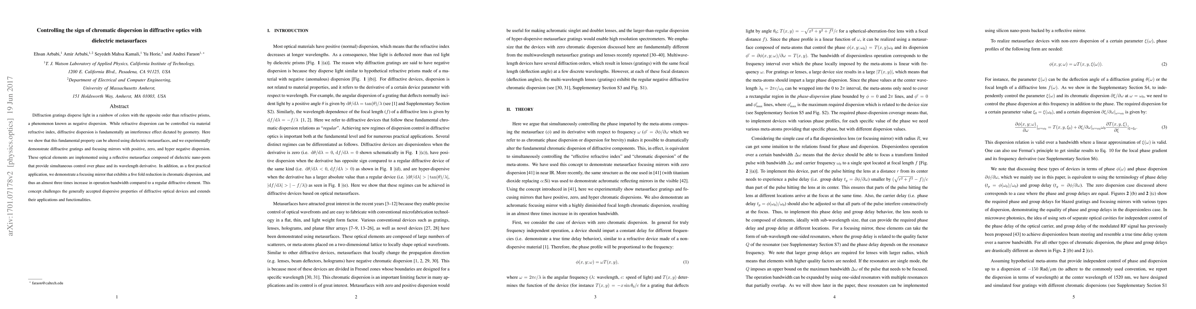 This paper demonstrates the manipulation of chromatic dispersion in diffractive optics using dielectric metasurfaces, achieving positive, zero, and hyper negative dispersion. The metasurfaces, composed of nano-posts, provide control over phase and its wavelength derivative, enabling a five-fold reduction in chromatic dispersion and a significant increase in operational bandwidth for focusing mirrors.