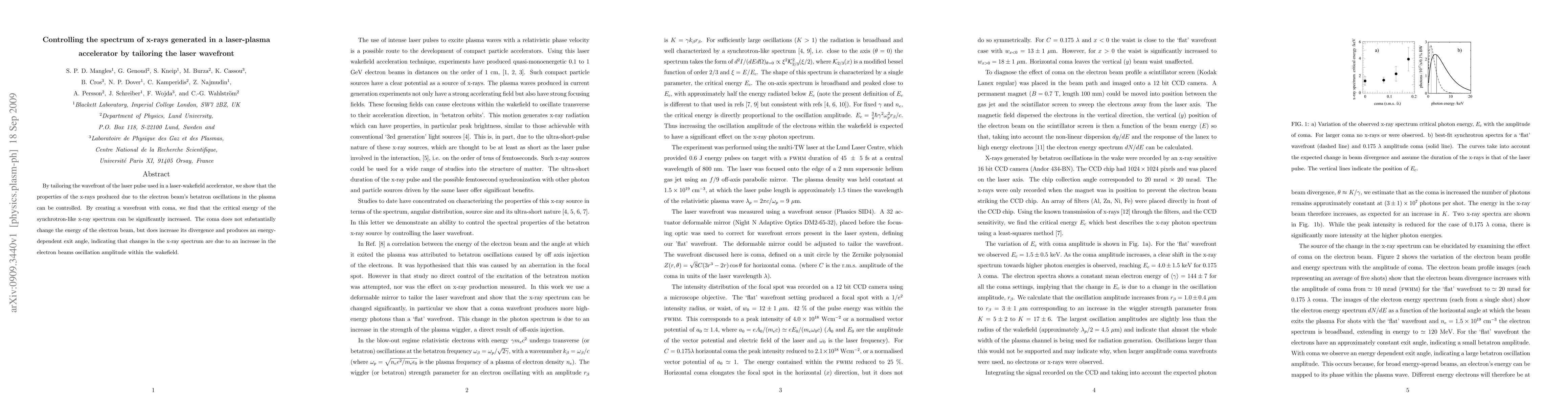 This research demonstrates that modifying the laser wavefront in a laser-plasma accelerator can control the spectrum of x-rays generated, specifically increasing the critical energy of the synchrotron-like spectrum through the introduction of coma. The changes in the x-ray spectrum are attributed to enhanced electron beam oscillation amplitude within the wakefield, without significantly altering the electron beam's energy.