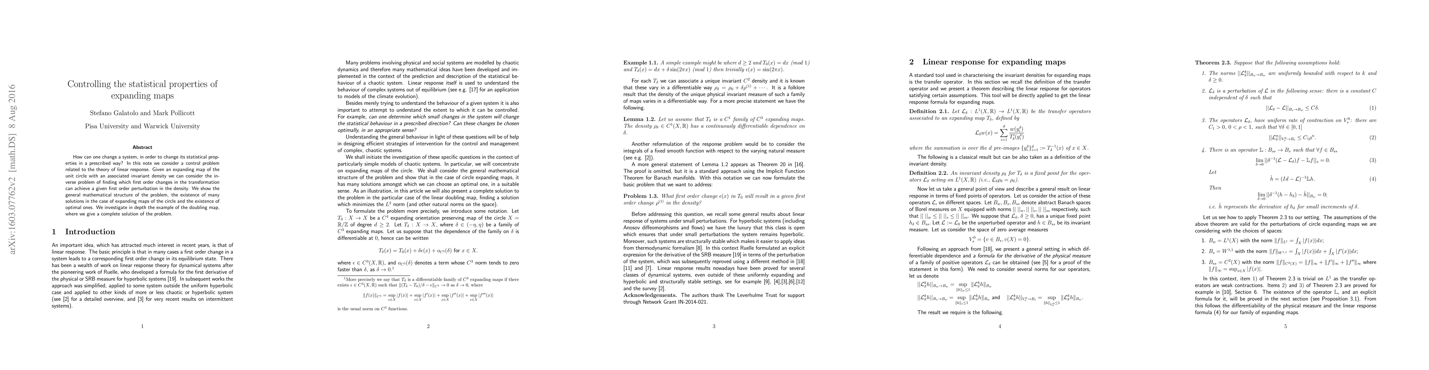 How can one change a system, in order to change its statistical properties in a prescribed way? In this note we consider a control problem related to the theory of linear response. Given an expanding map of the unit circle with an associated invariant density we can consider the inverse problem of finding which first order changes in the transformation can achieve a given first order perturbation in the density. We show the general mathematical structure of the problem, the existence of many solutions in the case of expanding maps of the circle and the existence of optimal ones. We investigate in depth the example of the doubling map, where we give a complete solution of the problem.