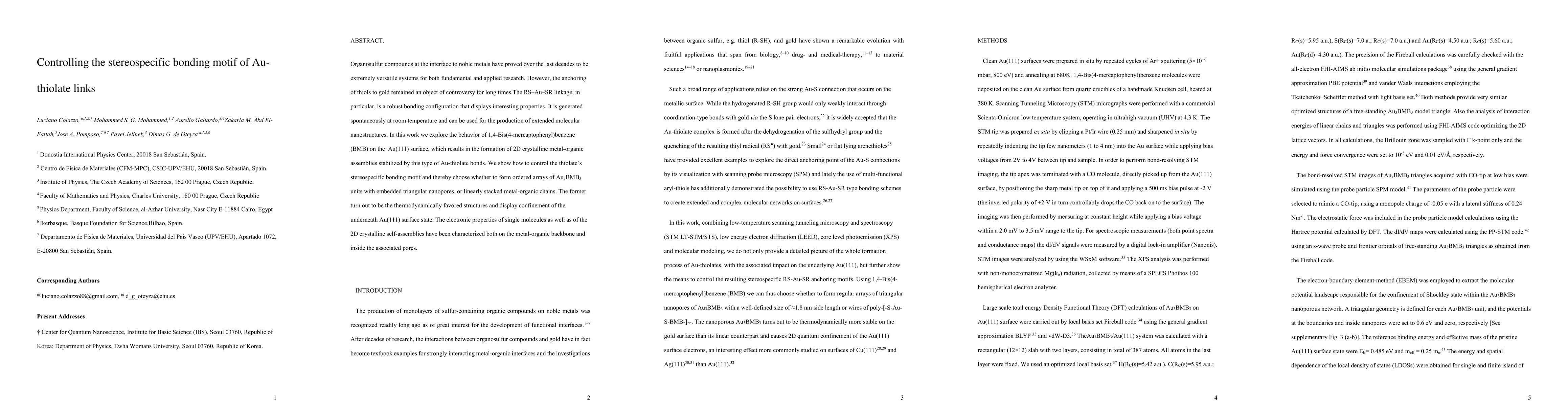 Organosulfur compounds at the interface to noble metals have proved over the last decades to be extremely versatile systems for both fundamental and applied research. However, the anchoring of thiols to gold remained an object of controversy for long times. The RS-Au-SR linkage, in particular, is a robust bonding configuration that displays interesting properties. It is generated spontaneously at room temperature and can be used for the production of extended molecular nanostructures. In this work we explore the behavior of 1,4-Bis(4-mercaptophenyl)benzene (BMB) on the Au(111) surface, which results in the formation of 2D crystalline metal-organic assemblies stabilized by this type of Au-thiolate bonds. We show how to control the thiolates stereospecific bonding motif and thereby choose whether to form ordered arrays of Au3BMB3 units with embedded triangular nanopores, or linearly stacked metal-organic chains. The former turn out to be the thermodynamically favored structures and display confinement of the underneath Au(111) surface state. The electronic properties of single molecules as well as of the 2D crystalline self-assemblies have been characterized both on the metal-organic backbone and inside the associated pores.