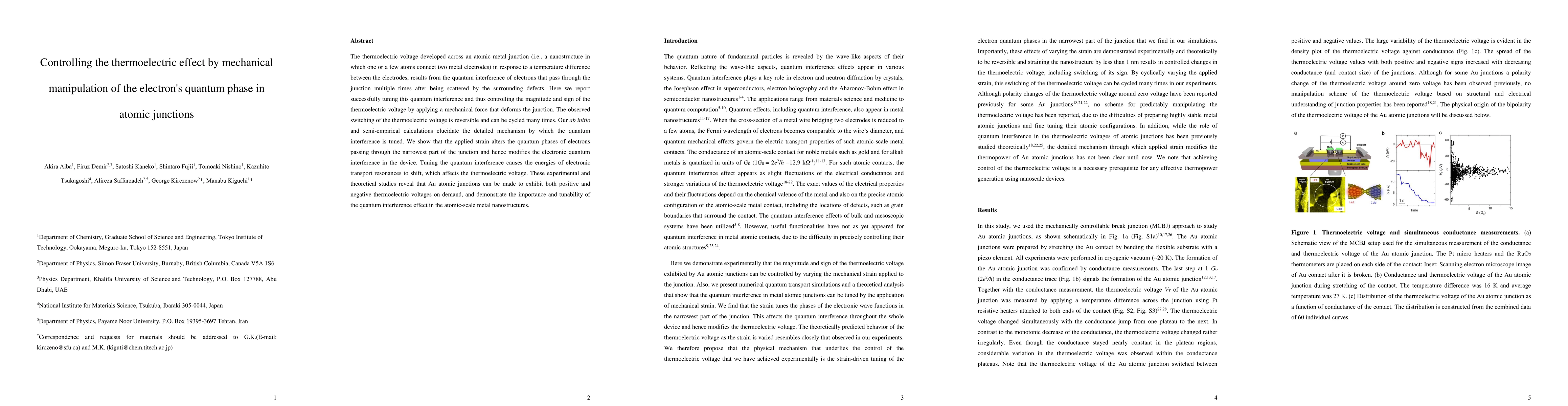 The thermoelectric voltage developed across an atomic metal junction (i.e., a nanostructure in which one or a few atoms connect two metal electrodes) in response to a temperature difference between the electrodes, results from the quantum interference of electrons that pass through the junction multiple times after being scattered by the surrounding defects. Here we report successfully tuning this quantum interference and thus controlling the magnitude and sign of the thermoelectric voltage by applying a mechanical force that deforms the junction. The observed switching of the thermoelectric voltage is reversible and can be cycled many times. Our ab initio and semi-empirical calculations elucidate the detailed mechanism by which the quantum interference is tuned. We show that the applied strain alters the quantum phases of electrons passing through the narrowest part of the junction and hence modifies the electronic quantum interference in the device. Tuning the quantum interference causes the energies of electronic transport resonances to shift, which affects the thermoelectric voltage. These experimental and theoretical studies reveal that Au atomic junctions can be made to exhibit both positive and negative thermoelectric voltages on demand, and demonstrate the importance and tunability of the quantum interference effect in the atomic-scale metal nanostructures.