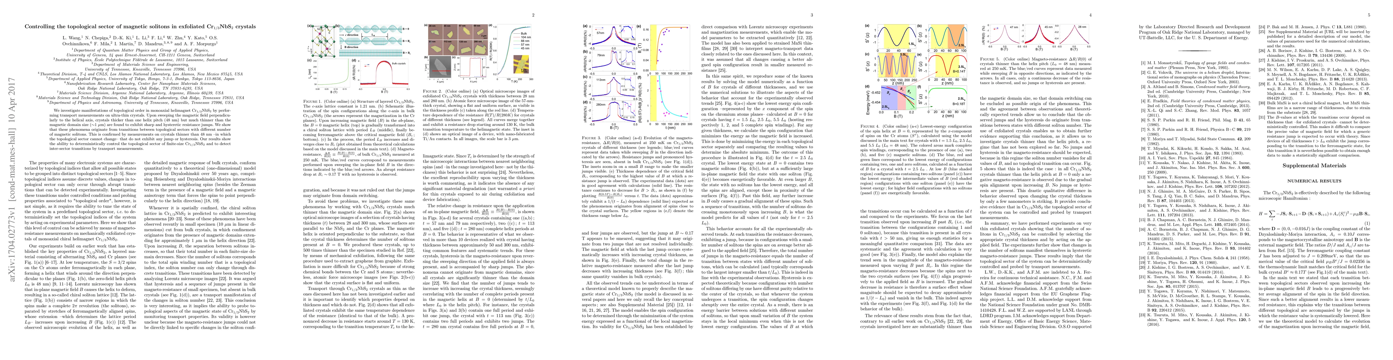 The research explores topological order in Cr$_{1/3}$NbS$_2$ through transport measurements in ultra-thin crystals, revealing that thicker crystals exhibit sharp resistance jumps due to transitions between topological sectors differing in magnetic soliton counts. Control over the topological sector is demonstrated via hysteretic behavior detectable by transport measurements.