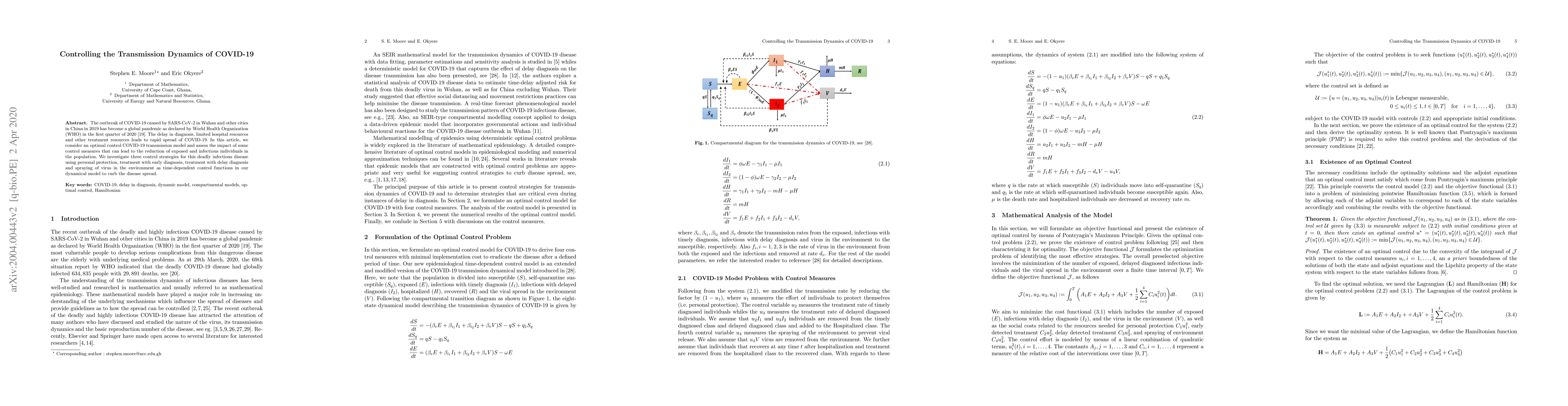 This paper develops an optimal control model to analyze COVID-19 transmission dynamics and evaluates the effectiveness of various control measures, including personal protection, early diagnosis treatment, delayed diagnosis treatment, and environmental virus spraying, to reduce the spread of the disease. The study aims to identify strategies that can minimize exposed and infectious individuals.