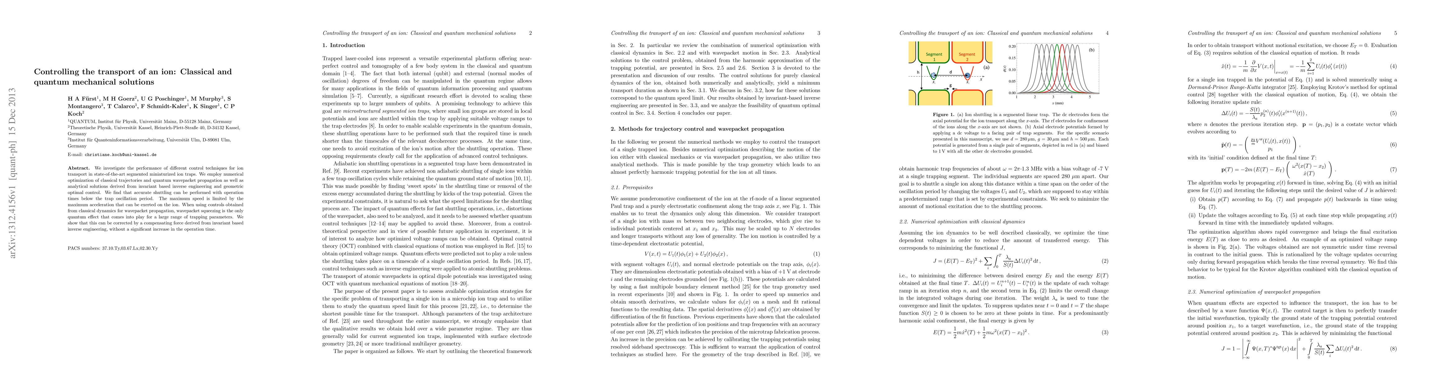 We investigate the performance of different control techniques for ion transport in state-of-the-art segmented miniaturized ion traps. We employ numerical optimization of classical trajectories and quantum wavepacket propagation as well as analytical solutions derived from invariant based inverse engineering and geometric optimal control. We find that accurate shuttling can be performed with operation times below the trap oscillation period. The maximum speed is limited by the maximum acceleration that can be exerted on the ion. When using controls obtained from classical dynamics for wavepacket propagation, wavepacket squeezing is the only quantum effect that comes into play for a large range of trapping parameters. We show that this can be corrected by a compensating force derived from invariant based inverse engineering, without a significant increase in the operation time.