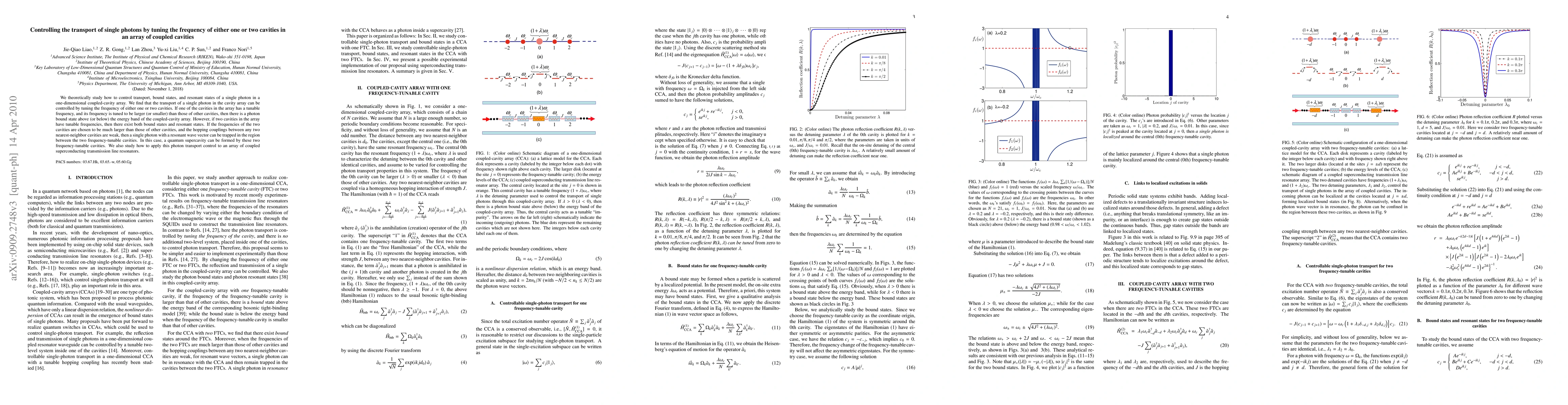 This paper explores the control of single photon transport in a coupled-cavity array by tuning the frequencies of one or two cavities. It demonstrates that tuning one cavity can create photon bound states, while tuning two cavities can generate both bound and resonant states, potentially forming a quantum supercavity.