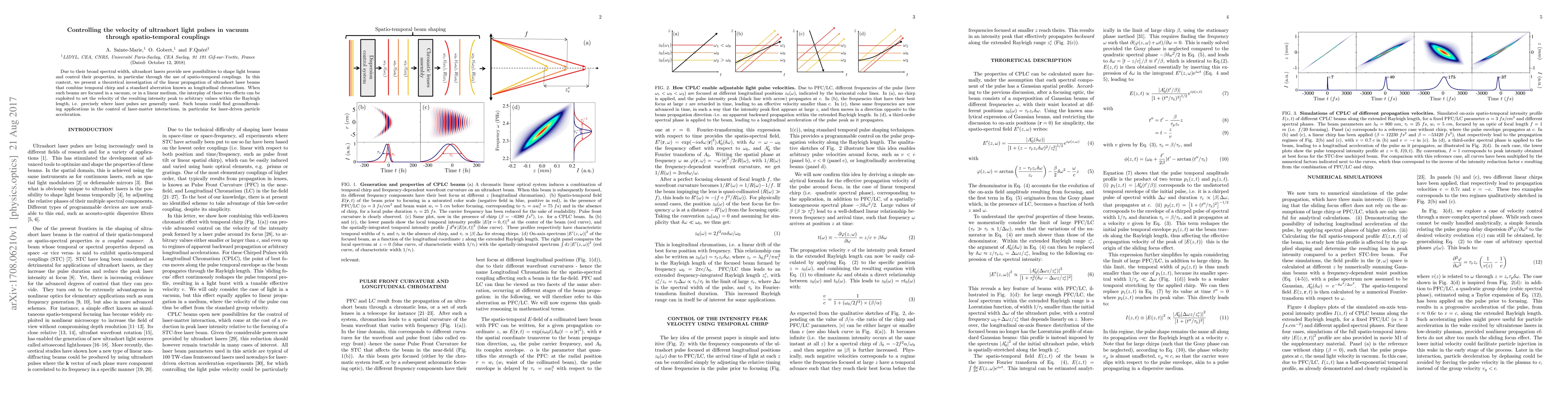 The paper presents a theoretical framework for controlling the velocity of ultrashort light pulses in vacuum through spatio-temporal couplings, specifically by combining temporal chirp and longitudinal chromatism.