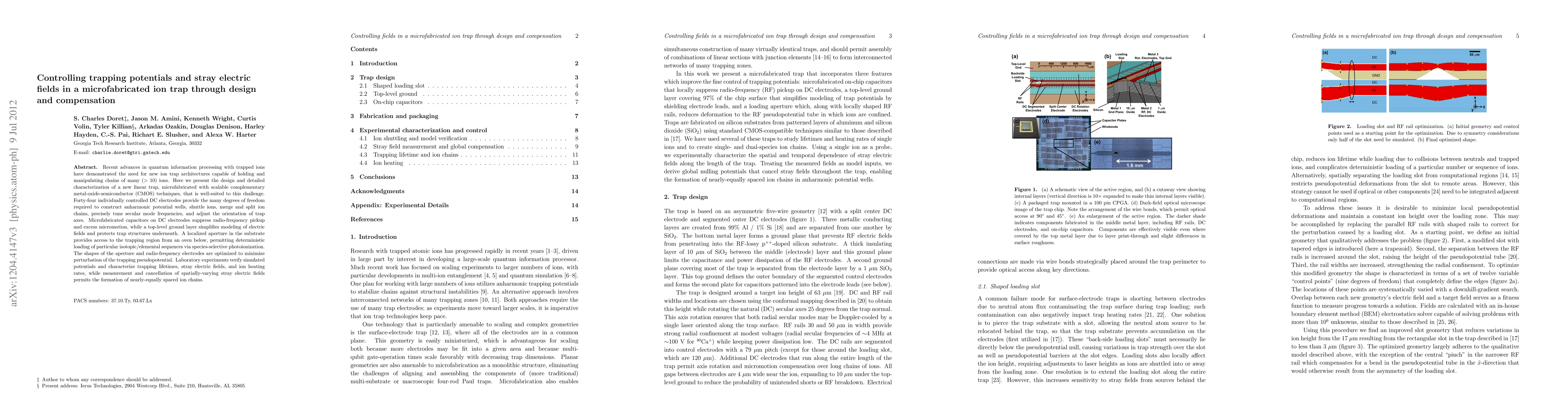 This paper details the design and characterization of a scalable microfabricated ion trap using CMOS techniques, featuring 44 individually controlled electrodes for precise ion manipulation. The design incorporates microfabricated capacitors and a substrate aperture to minimize perturbations and stray electric fields, enabling the formation of well-spaced ion chains for quantum information processing.