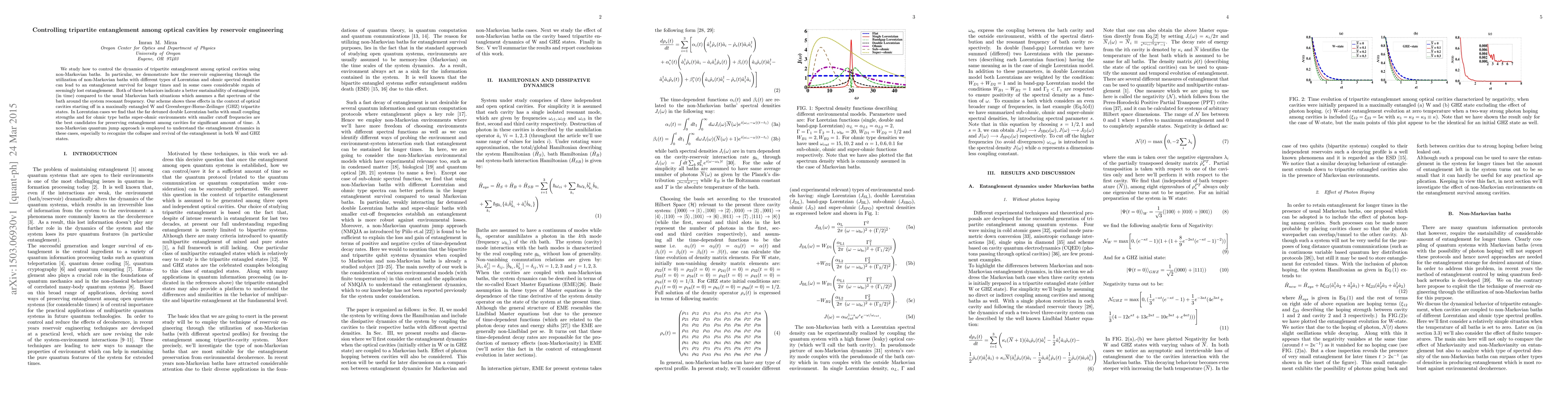 This paper explores controlling tripartite entanglement in optical cavities using non-Markovian baths, demonstrating that tailored reservoir engineering can extend entanglement survival and even recover lost entanglement, contrasting with typical Markovian bath assumptions. The study finds optimal conditions for preserving entanglement through specific Lorentzian and ohmic spectral densities.