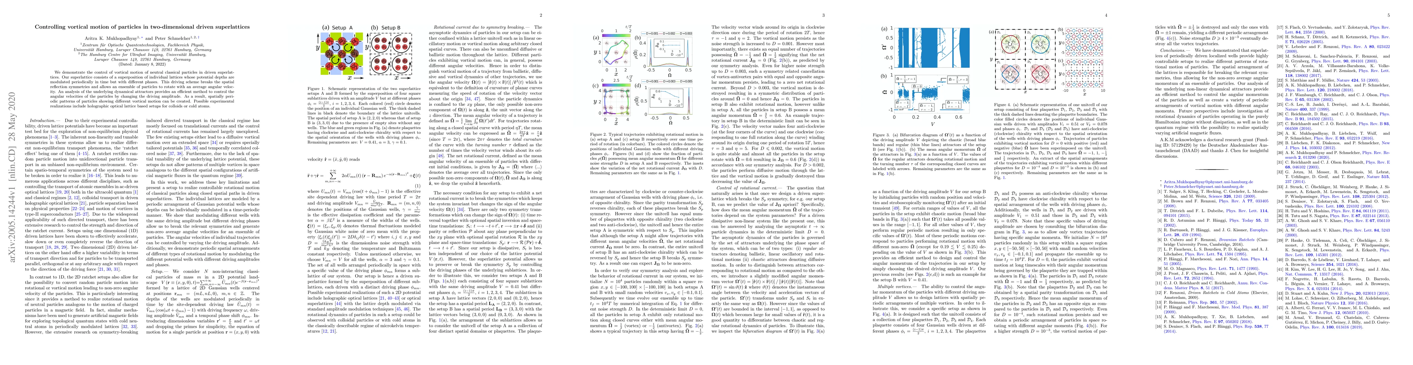 We demonstrate the control of vortical motion of neutral classical particles in driven superlattices. Our superlattice consists of a superposition of individual lattices whose potential depths are modulated periodically in time but with different phases. This driving scheme breaks the spatial reflection symmetries and allows an ensemble of particles to rotate with an average angular velocity. An analysis of the underlying dynamical attractors provides an efficient method to control the angular velocities of the particles by changing the driving amplitude. As a result, spatially periodic patterns of particles showing different vortical motion can be created. Possible experimental realizations include holographic optical lattice based setups for colloids or cold atoms.