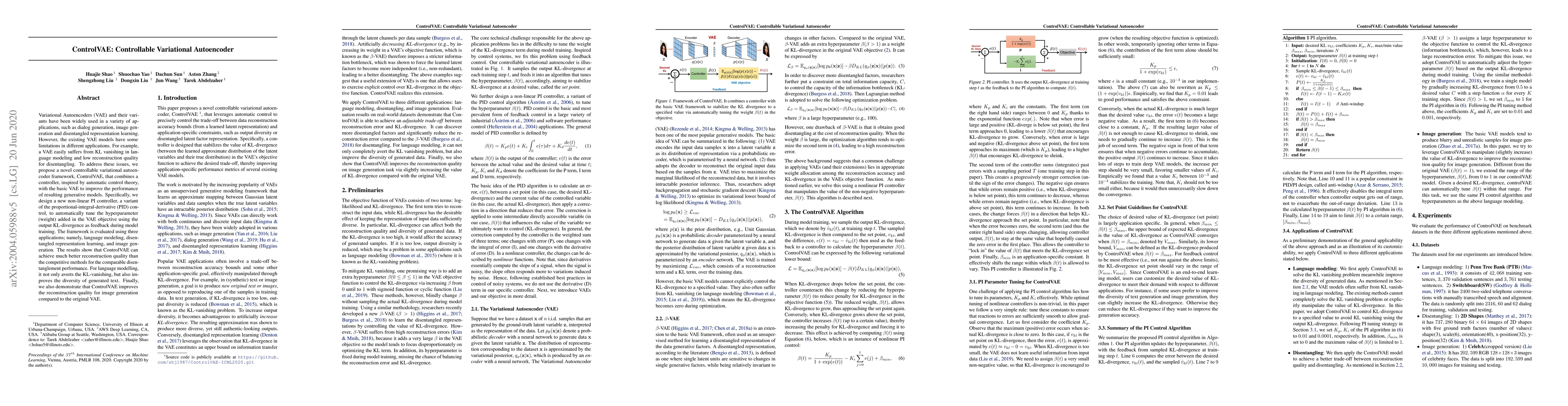 Variational Autoencoders (VAE) and their variants have been widely used in a variety of applications, such as dialog generation, image generation and disentangled representation learning. However, the existing VAE models have some limitations in different applications. For example, a VAE easily suffers from KL vanishing in language modeling and low reconstruction quality for disentangling. To address these issues, we propose a novel controllable variational autoencoder framework, ControlVAE, that combines a controller, inspired by automatic control theory, with the basic VAE to improve the performance of resulting generative models. Specifically, we design a new non-linear PI controller, a variant of the proportional-integral-derivative (PID) control, to automatically tune the hyperparameter (weight) added in the VAE objective using the output KL-divergence as feedback during model training. The framework is evaluated using three applications; namely, language modeling, disentangled representation learning, and image generation. The results show that ControlVAE can achieve better disentangling and reconstruction quality than the existing methods. For language modelling, it not only averts the KL-vanishing, but also improves the diversity of generated text. Finally, we also demonstrate that ControlVAE improves the reconstruction quality of generated images compared to the original VAE.