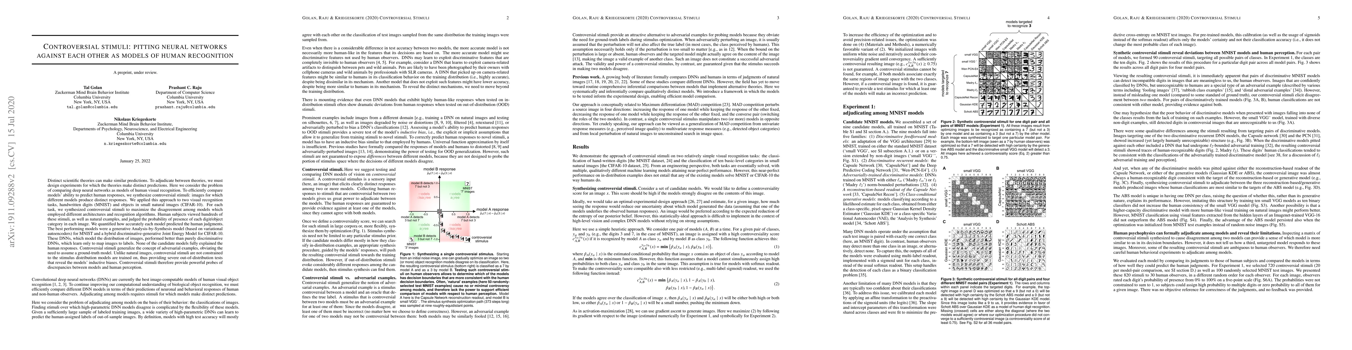 Distinct scientific theories can make similar predictions. To adjudicate between theories, we must design experiments for which the theories make distinct predictions. Here we consider the problem of comparing deep neural networks as models of human visual recognition. To efficiently compare models' ability to predict human responses, we synthesize controversial stimuli: images for which different models produce distinct responses. We applied this approach to two visual recognition tasks, handwritten digits (MNIST) and objects in small natural images (CIFAR-10). For each task, we synthesized controversial stimuli to maximize the disagreement among models which employed different architectures and recognition algorithms. Human subjects viewed hundreds of these stimuli, as well as natural examples, and judged the probability of presence of each digit/object category in each image. We quantified how accurately each model predicted the human judgments. The best performing models were a generative Analysis-by-Synthesis model (based on variational autoencoders) for MNIST and a hybrid discriminative-generative Joint Energy Model for CIFAR-10. These DNNs, which model the distribution of images, performed better than purely discriminative DNNs, which learn only to map images to labels. None of the candidate models fully explained the human responses. Controversial stimuli generalize the concept of adversarial examples, obviating the need to assume a ground-truth model. Unlike natural images, controversial stimuli are not constrained to the stimulus distribution models are trained on, thus providing severe out-of-distribution tests that reveal the models' inductive biases. Controversial stimuli therefore provide powerful probes of discrepancies between models and human perception.