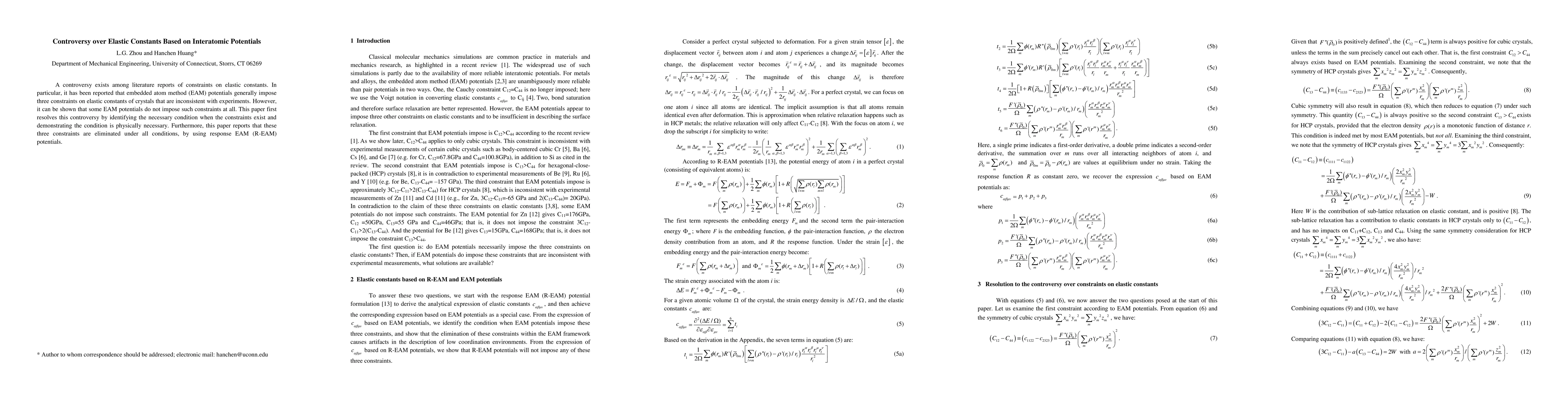 This paper resolves the controversy regarding constraints on elastic constants imposed by embedded atom method (EAM) potentials, showing that such constraints only exist under specific conditions and are physically necessary. It also demonstrates that response EAM (R-EAM) potentials eliminate these constraints entirely.