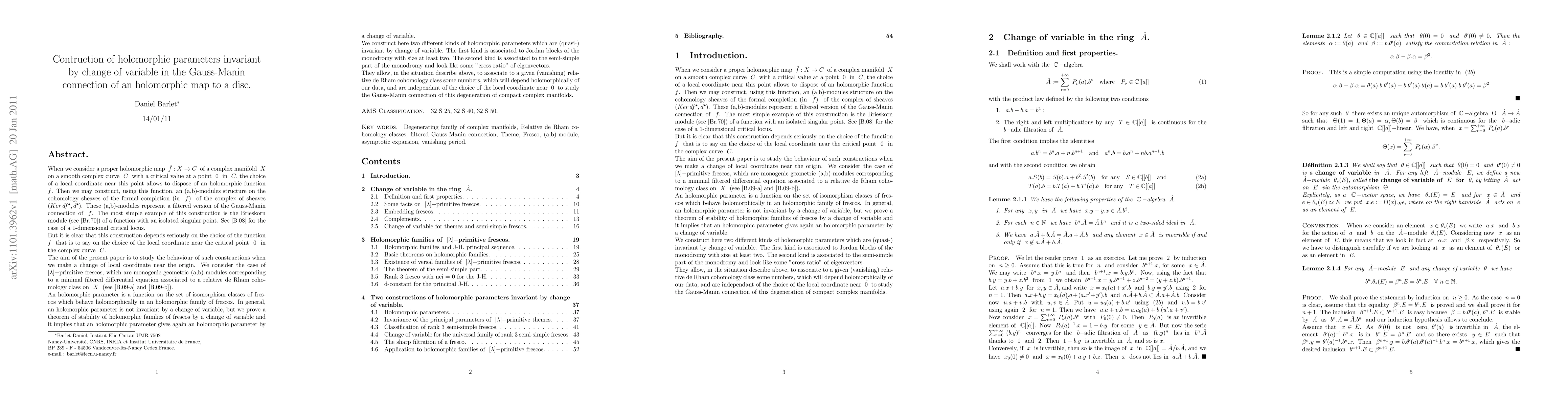 When we consider a proper holomorphic map \ $\tilde{f}: X \to C$ \ of a complex manifold \ $X$ \ on a smooth complex curve \ $C$ \ with a critical value at a point \ $0$ \ in \ $C$, the choice of a local coordinate near this point allows to dispose of an holomorphic function \ $f$. Then we may construct, using this function, an (a,b)-modules structure on the cohomology sheaves of the formal completion (in \ $f$) \ of the complex of sheaves \ $(Ker\, df^{\bullet},d^{\bullet})$. These (a,b)-modules represent a filtered version of the Gauss-Manin connection of \ $f$. The most simple example of this construction is the Brieskorn module (see [Br.70]) of a function with an isolated singular point. See [B.08] for the case of a 1-dimensional critical locus. But it is clear that this construction depends seriously on the choice of the function \ $f$ \ that is to say on the choice of the local coordinate near the critical point \ $0$ \ in the complex curve \ $C$. The aim of the present paper is to study the behaviour of such constructions when we make a change of local coordinate near the origin. We consider the case of \ $[\lambda]-$primitive frescos, which are monogenic geometric (a,b)-modules corresponding to a minimal filtered differential equation associated to a relative de Rham cohomology class on \ $X$ \ (see [B.09-a] and [B.09-b]). An holomorphic parameter is a function on the set of isomorphism classes of frescos which behave holomorphically in an holomorphic family of frescos. In general, an holomorphic parameter is not invariant by a change of variable, but we prove a theorem of stability of holomorphic families of frescos by a change of variable and it implies that an holomorphic parameter gives again an holomorphic parameter by a change of variable. We construct here two different kinds of holomorphic parameters which are (quasi-)invariant by change of variable. The first kind is associated to Jordan blocks of the monodromy with size at least two. The second kind is associated to the semi-simple part of the monodromy and look like some "cross ratio" of eigenvectors. They allow, in the situation describe above, to associate to a given (vanishing) relative de Rham cohomology class some numbers, which will depend holomorphically of our data, and are independant of the choice of the local coordinate near \ $0$ \ to study the Gauss-Manin connection of this degeneration of compact complex manifolds.