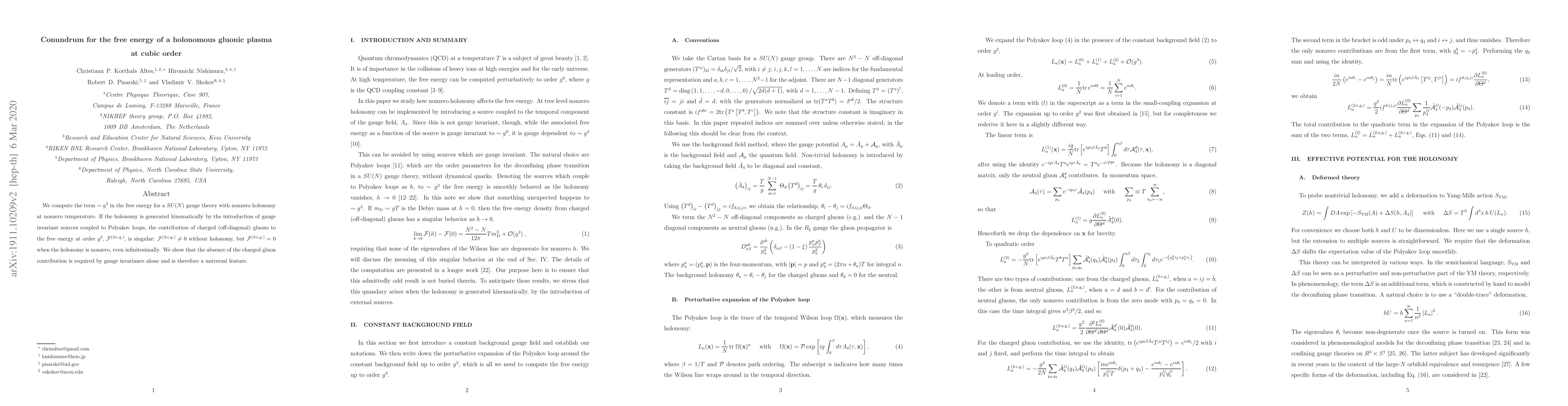 We compute the term $\sim g^3$ in the free energy for a $SU(N)$ gauge theory with nonzero holonomy at nonzero temperature. If the holonomy is generated kinematically by the introduction of gauge invariant sources coupled to Polyakov loops, the contribution of charged (off-diagonal) gluons to the free energy at order $g^3$, ${\cal F}^{\left( 3\rm{:c.g.} \right)}$, is singular: ${\cal F}^{\left( 3\rm{:c.g.} \right)} \neq 0 $ without holonomy, but ${\cal F}^{\left( 3 \rm{:c.g.} \right)}= 0$ when the holonomy is nonzero, even infinitesimally. We show that the absence of the charged gluon contribution is required by gauge invariance alone and is therefore a universal feature.