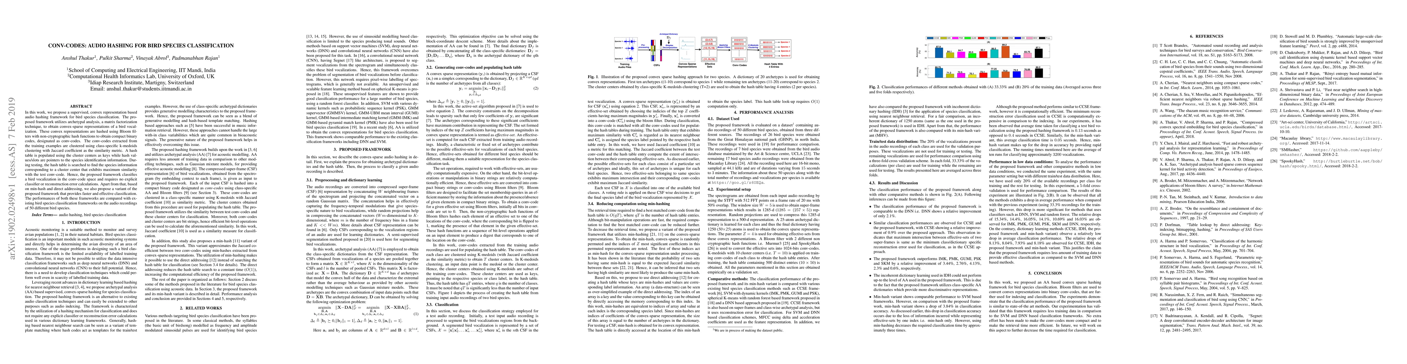 This paper proposes a supervised audio hashing framework for bird species classification using convex-sparse representations and Bloom filters. The framework classifies bird vocalizations by clustering conv-codes and searching a hash table for species identification, requiring no explicit classifier or reconstruction error calculations.