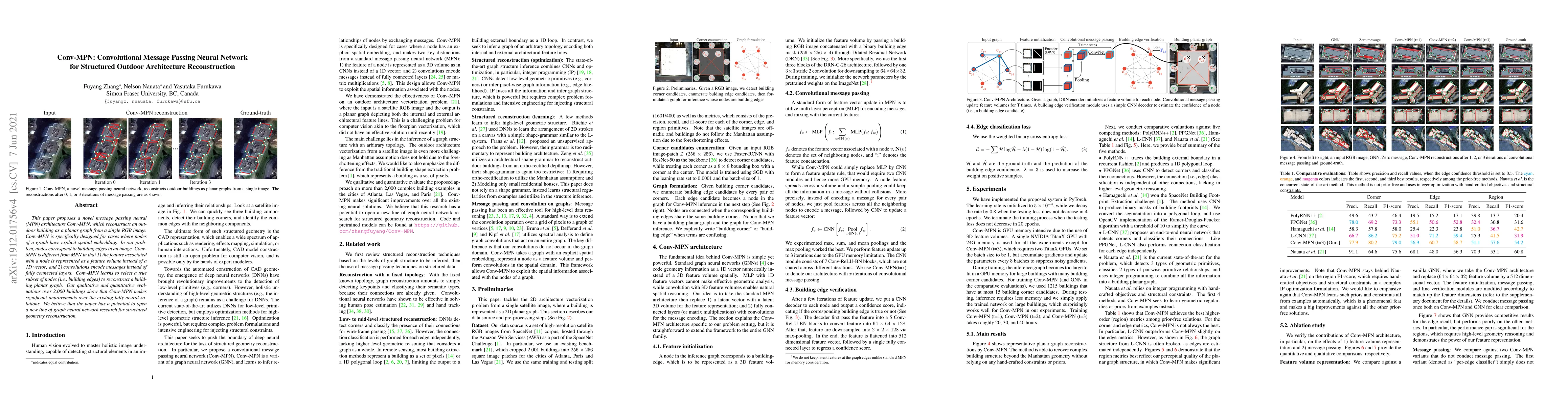 The paper introduces Conv-MPN, a novel message passing neural network architecture for reconstructing building layouts from single RGB images. Conv-MPN differs from traditional MPNs by representing node features as feature volumes and using convolutions to encode messages, rather than fully connected layers. Evaluations on 2,000 buildings demonstrate significant improvements over existing neural solutions, suggesting potential for new graph neural network research in structured geometry reconstruction.