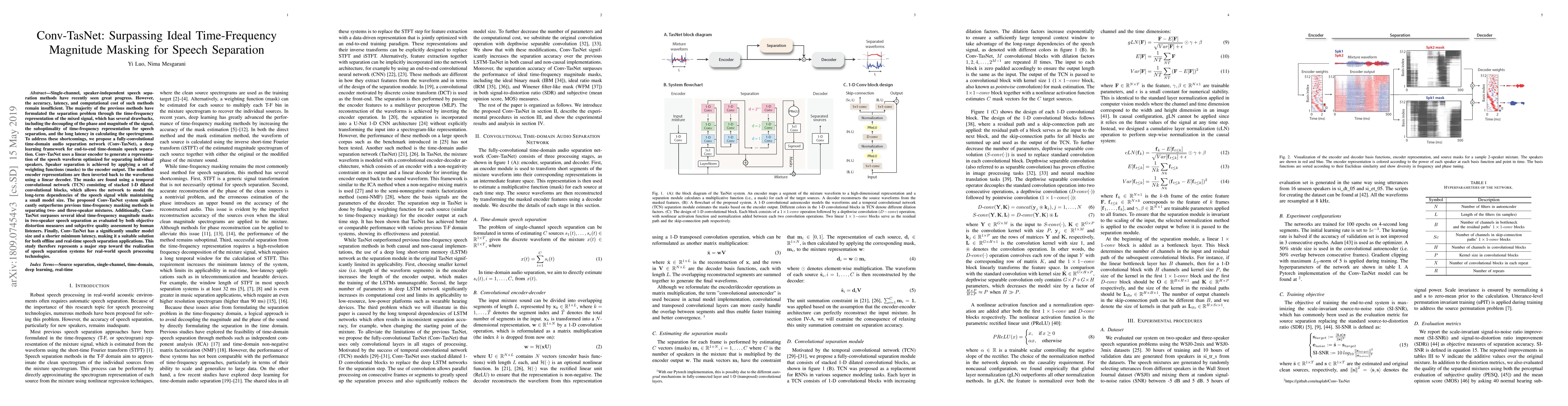 Conv-TasNet introduces a fully-convolutional time-domain network for speaker-independent speech separation, achieving better separation accuracy and lower latency compared to time-frequency masking methods while requiring fewer computational resources.