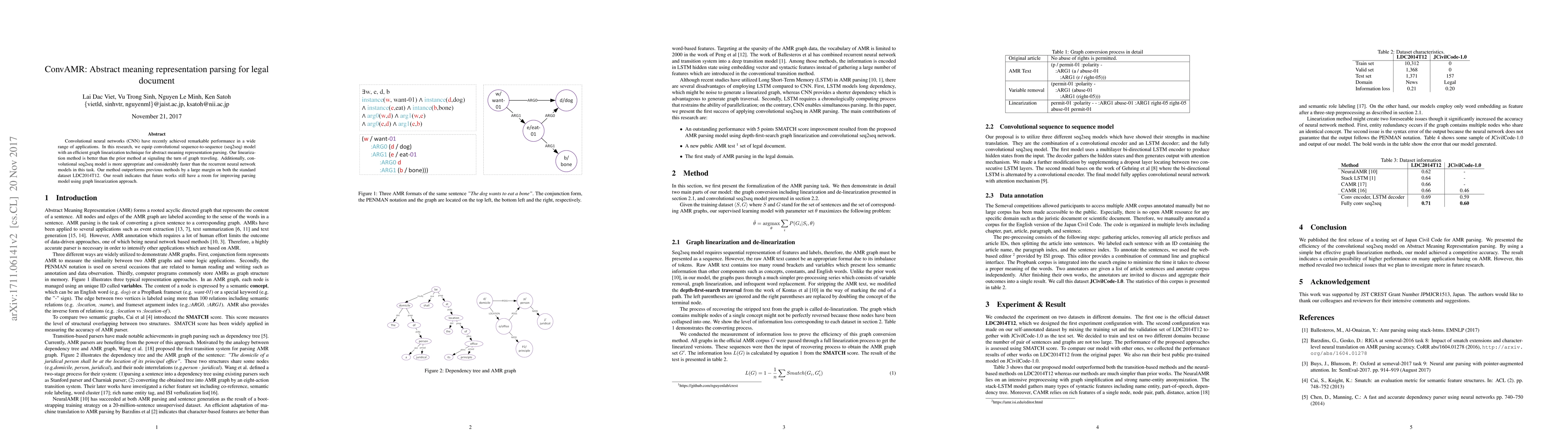 This research introduces a convolutional sequence-to-sequence model with an efficient graph linearization technique for parsing abstract meaning representations in legal documents, outperforming previous methods significantly on the LDC2014T12 dataset and indicating potential for further improvements.