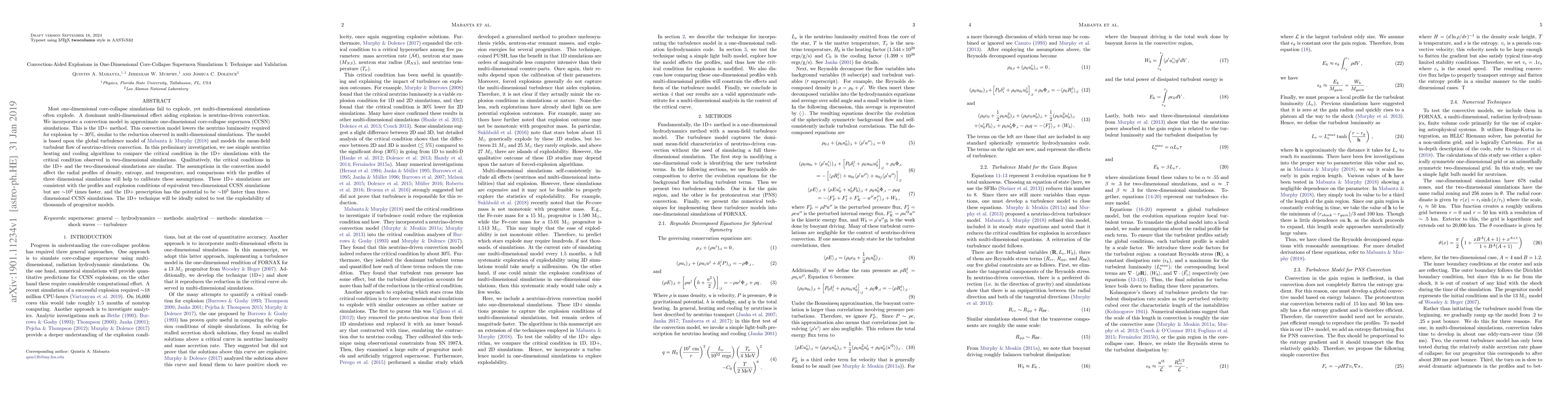 Most one-dimensional core-collapse simulations fail to explode, yet multi-dimensional simulations often explode. A dominant multi-dimensional effect aiding explosion is neutrino-driven convection. We incorporate a convection model in approximate one-dimensional core-collapse supernova (CCSN) simulations. This is the 1D+ method. This convection model lowers the neutrino luminosity required for explosion by 30%, similar to the reduction observed in multi-dimensional simulations. The model is based upon the global turbulence model of Mabanta & Murphy (2018) and models the mean-field turbulent flow of neutrino-driven convection. In this preliminary investigation, we use simple neutrino heating and cooling algorithms to compare the critical condition in the 1D+ simulations with the critical condition observed in two-dimensional simulations. Qualitatively, the critical conditions in the 1D+ and the two-dimensional simulations are similar. The assumptions in the convection model affect the radial profiles of density, entropy, and temperature, and comparisons with the profiles of three dimensional simulations will help to calibrate these assumptions. These 1D+ simulations are consistent with the profiles and explosion conditions of equivalent two-dimensional CCSN simulations but are ~100 times faster, and the 1D+ prescription has the potential to be ~100,000 faster than three-dimensional CCSN simulations. The 1D+ technique will be ideally suited to test the explodability of thousands of progenitor models.