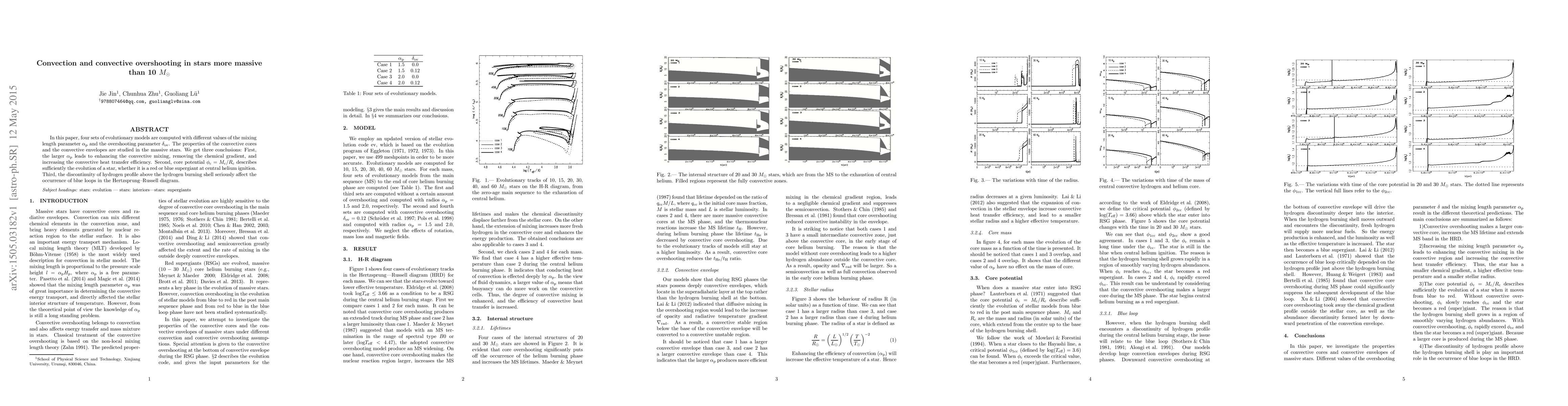 In this paper, four sets of evolutionary models are computed with different values of the mixing length parameter $\alpha_{\rm p}$ and the overshooting parameter $\delta_{\rm ov}$. The properties of the convective cores and the convective envelopes are studied in the massive stars. We get three conclusions: First, the larger $\alpha_{\rm p}$ leads to enhancing the convective mixing, removing the chemical gradient, and increasing the convective heat transfer efficiency. Second, core potential $\phi_{\rm c} = M_{\rm c} / R_{\rm c}$ describes sufficiently the evolution of a star, whether it is a red or blue supergiant at central helium ignition. Third, the discontinuity of hydrogen profile above the hydrogen burning shell seriously affect the occurrence of blue loops in the Hertzsprung--Russell diagram.