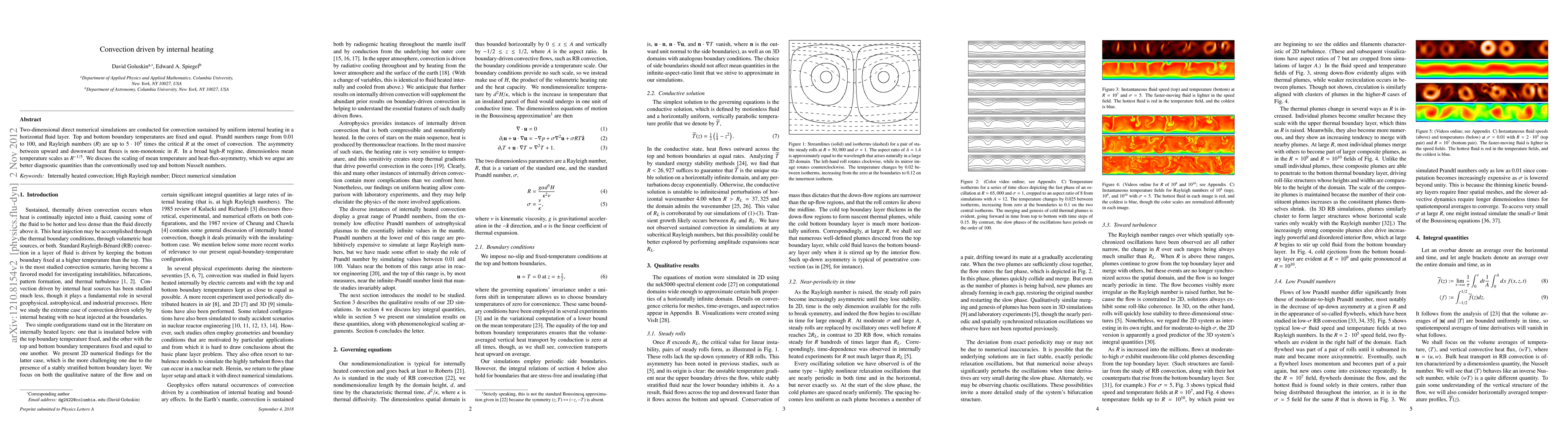 Researchers conducted 2D simulations of convection driven by internal heating in a horizontal fluid layer, finding that dimensionless mean temperature scales as R^(-1/5) at high Rayleigh numbers.