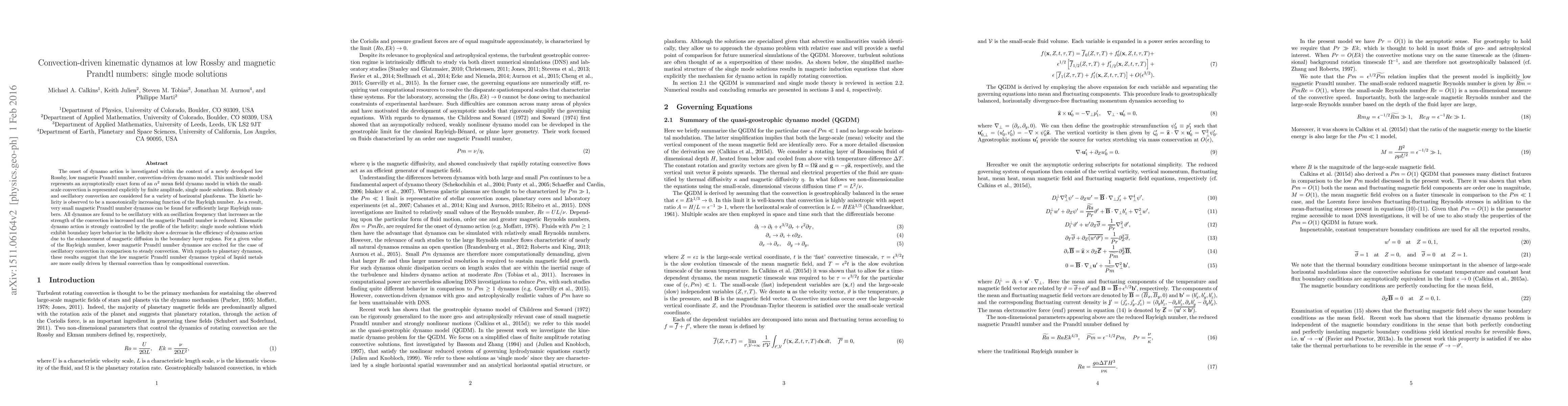 The onset of dynamo action is investigated within the context of a newly developed low Rossby, low magnetic Prandtl number, convection-driven dynamo model. This multiscale model represents an asymptotically exact form of an $\alpha^2$ mean field dynamo model in which the small-scale convection is represented explicitly by finite amplitude, single mode solutions. Both steady and oscillatory convection are considered for a variety of horizontal planforms. The kinetic helicity is observed to be a monotonically increasing function of the Rayleigh number. As a result, very small magnetic Prandtl number dynamos can be found for sufficiently large Rayleigh numbers. All dynamos are found to be oscillatory with an oscillation frequency that increases as the strength of the convection is increased and the magnetic Prandtl number is reduced. Kinematic dynamo action is strongly controlled by the profile of the helicity; single mode solutions which exhibit boundary layer behavior in the helicity show a decrease in the efficiency of dynamo action due to the enhancement of magnetic diffusion in the boundary layer regions. For a given value of the Rayleigh number, lower magnetic Prandtl number dynamos are excited for the case of oscillatory convection in comparison to steady convection. With regards to planetary dynamos, these results suggest that the low magnetic Prandtl number dynamos typical of liquid metals are more easily driven by thermal convection than by compositional convection.