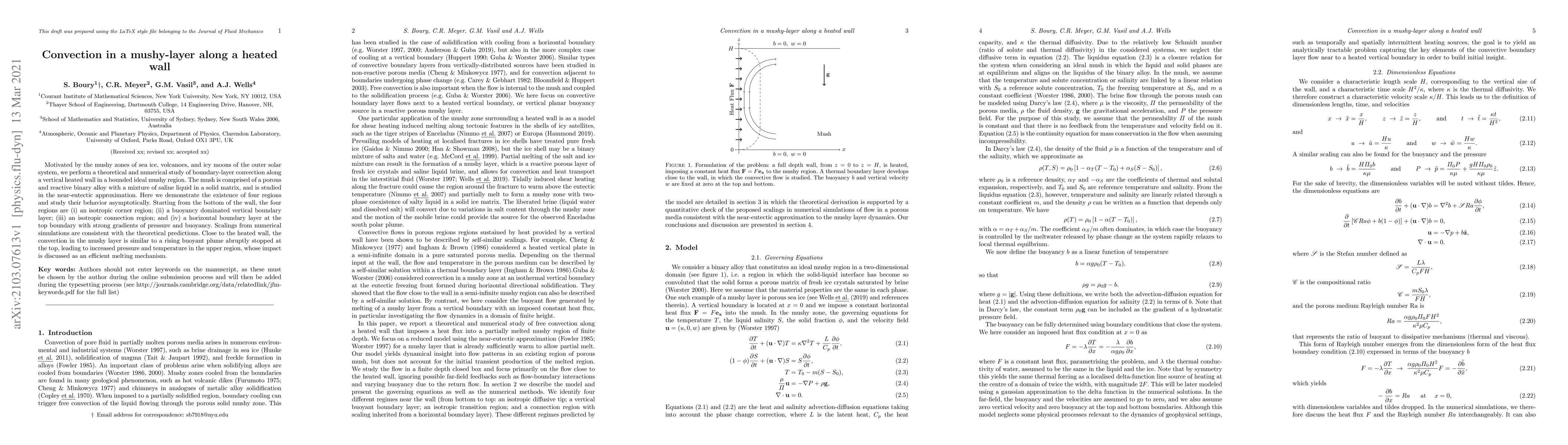 Motivated by the mushy zones of sea ice, volcanoes, and icy moons of the outer solar system, we perform a theoretical and numerical study of boundary-layer convection along a vertical heated wall in a bounded ideal mushy region. The mush is comprised of a porous and reactive binary alloy with a mixture of saline liquid in a solid matrix, and is studied in the near-eutectic approximation. Here we demonstrate the existence of four regions and study their behavior asymptotically. Starting from the bottom of the wall, the four regions are (i) an isotropic corner region; (ii) a buoyancy dominated vertical boundary layer; (iii) an isotropic connection region; and (iv) a horizontal boundary layer at the top boundary with strong gradients of pressure and buoyancy. Scalings from numerical simulations are consistent with the theoretical predictions. Close to the heated wall, the convection in the mushy layer is similar to a rising buoyant plume abruptly stopped at the top, leading to increased pressure and temperature in the upper region, whose impact is discussed as an efficient melting mechanism.