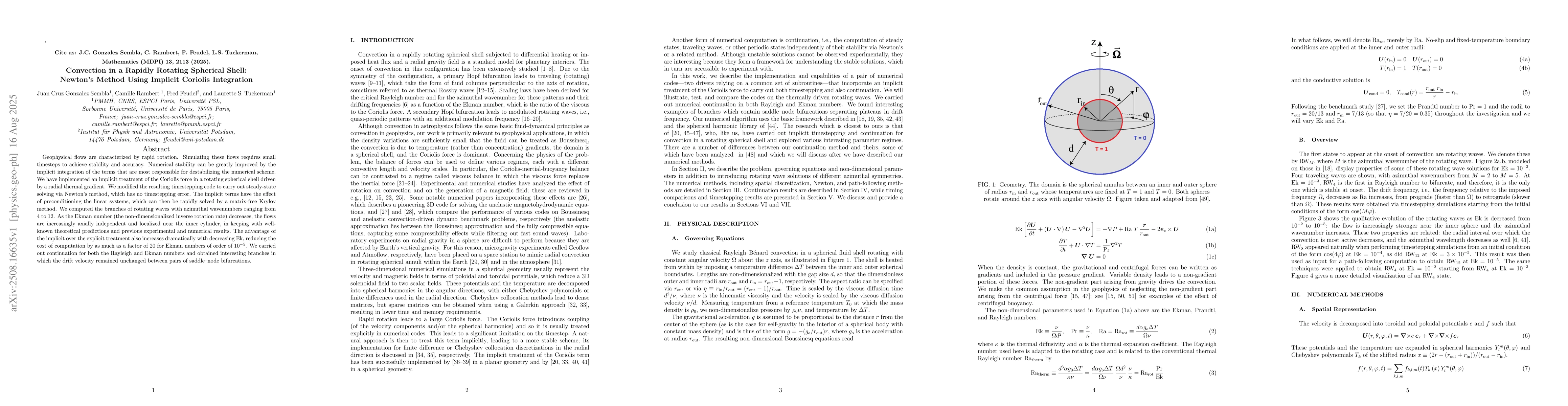 Geophysical flows are characterized by rapid rotation. Simulating these flows requires small timesteps to achieve stability and accuracy. Numerical stability can be greatly improved by the implicit integration of the terms that are most responsible for destabilizing the numerical scheme. We have implemented an implicit treatment of the Coriolis force in a rotating spherical shell driven by a radial thermal gradient. We modified the resulting timestepping code to carry out steady-state solving via Newton's method, which has no timestepping error. The implicit terms have the effect of preconditioning the linear systems, which can then be rapidly solved by a matrix-free Krylov method. We computed the branches of rotating waves with azimuthal wavenumbers ranging from 4 to 12. As the Ekman number (the non-dimensionalized inverse rotation rate) decreases, the flows are increasingly axially independent and localized near the inner cylinder, in keeping with well-known theoretical predictions and previous experimental and numerical results. The advantage of the implicit over the explicit treatment also increases dramatically with decreasing Ekman numbers, reducing the cost of computation by as much as a factor of 20 for Ekman numbers of order of $10^{-5}$. We carried out continuation for both the Rayleigh and Ekman numbers and obtained interesting branches in which the drift velocity remained unchanged between pairs of saddle-node bifurcations.