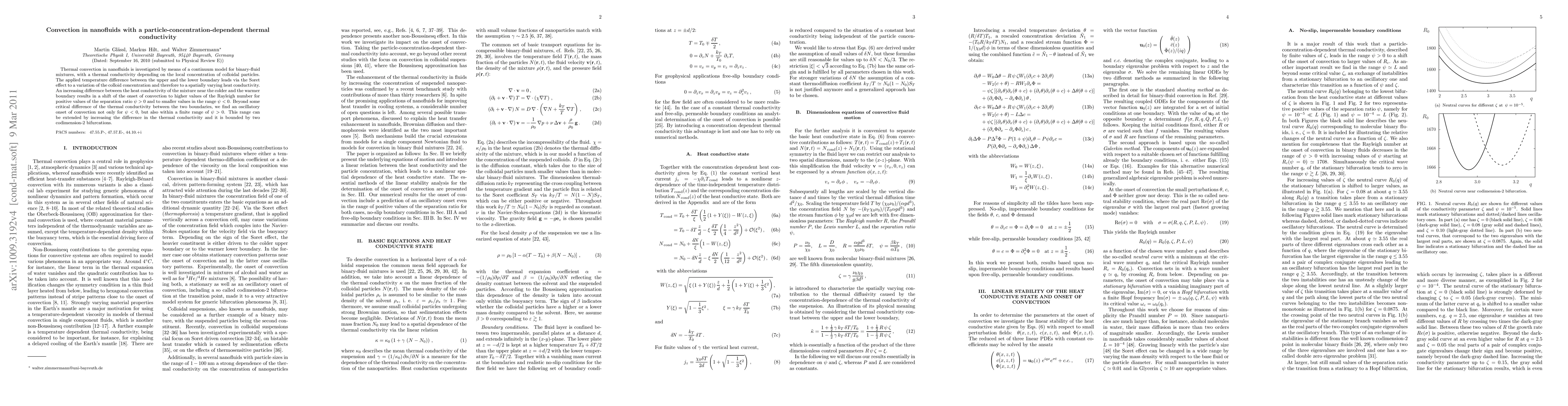 The research employs a continuum model for binary-fluid mixtures, extending beyond the Boussinesq approximation to include a linear dependence of thermal conductivity on local colloidal particle concentration, to investigate thermal convection in nanofluids with particle-concentration-dependent thermal conductivity.