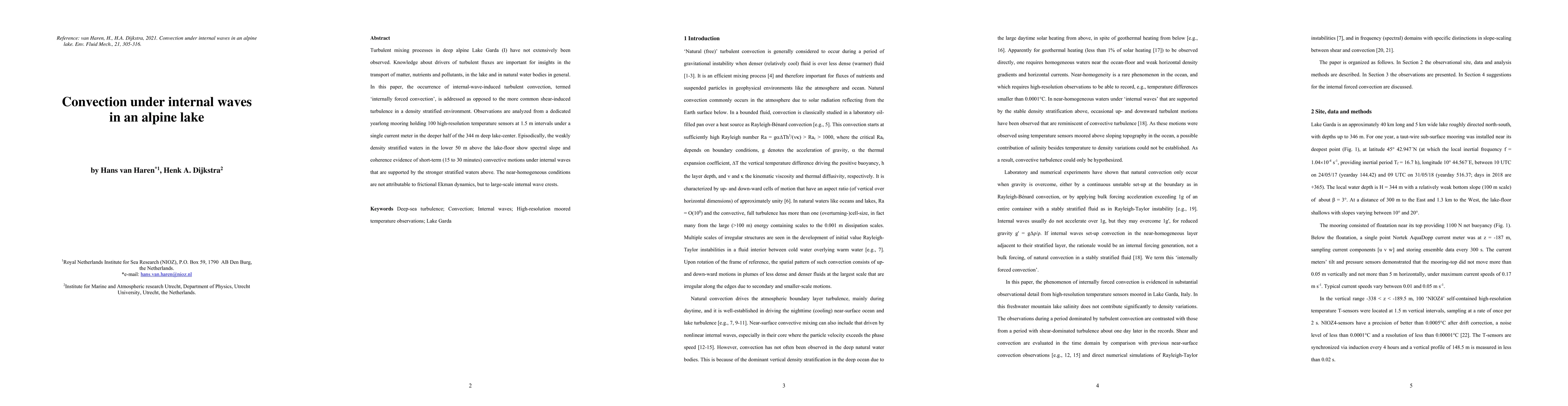 Turbulent mixing processes in deep alpine Lake Garda (I) have not extensively been observed. Knowledge about drivers of turbulent fluxes are important for insights in the transport of matter, nutrients and pollutants, in the lake and in natural water bodies in general. In this paper, the occurrence of internal wave induced turbulent convection is addressed as opposed to the more common shear-induced turbulence in a density stratified environment. Observations are analyzed from a dedicated yearlong mooring holding 100 high-resolution temperature sensors at 1.5 m intervals under a single current meter in the deeper half of the 344 m deep lake-center. Episodically, the weakly density stratified waters in the lower 50 m above the lake floor show spectral slope and coherence evidence of short-term (15 to 30 minutes) convective motions under internal waves that are supported by the stronger stratified waters above. The near-homogeneous conditions are not attributable to frictional Ekman dynamics, but to large-scale internal wave crests.