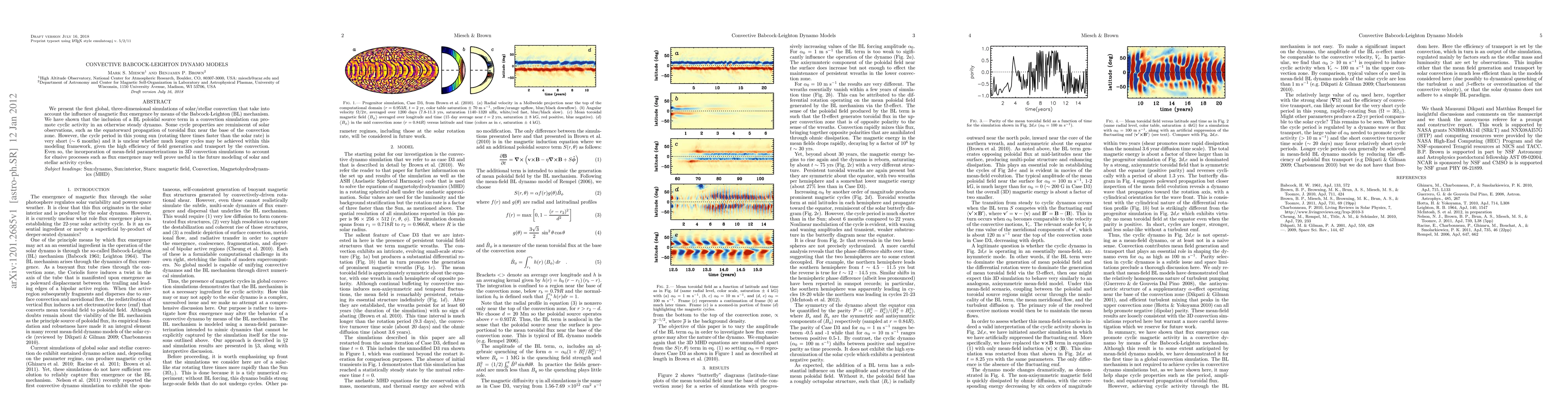 We present the first global, three-dimensional simulations of solar/stellar convection that take into account the influence of magnetic flux emergence by means of the Babcock-Leighton (BL) mechanism. We have shown that the inclusion of a BL poloidal source term in a convection simulation can promote cyclic activity in an otherwise steady dynamo. Some cycle properties are reminiscent of solar observations, such as the equatorward propagation of toroidal flux near the base of the convection zone. However, the cycle period in this young sun (rotating three times faster than the solar rate) is very short ($\sim$ 6 months) and it is unclear whether much longer cycles may be achieved within this modeling framework, given the high efficiency of field generation and transport by the convection. Even so, the incorporation of mean-field parameterizations in 3D convection simulations to account for elusive processes such as flux emergence may well prove useful in the future modeling of solar and stellar activity cycles.