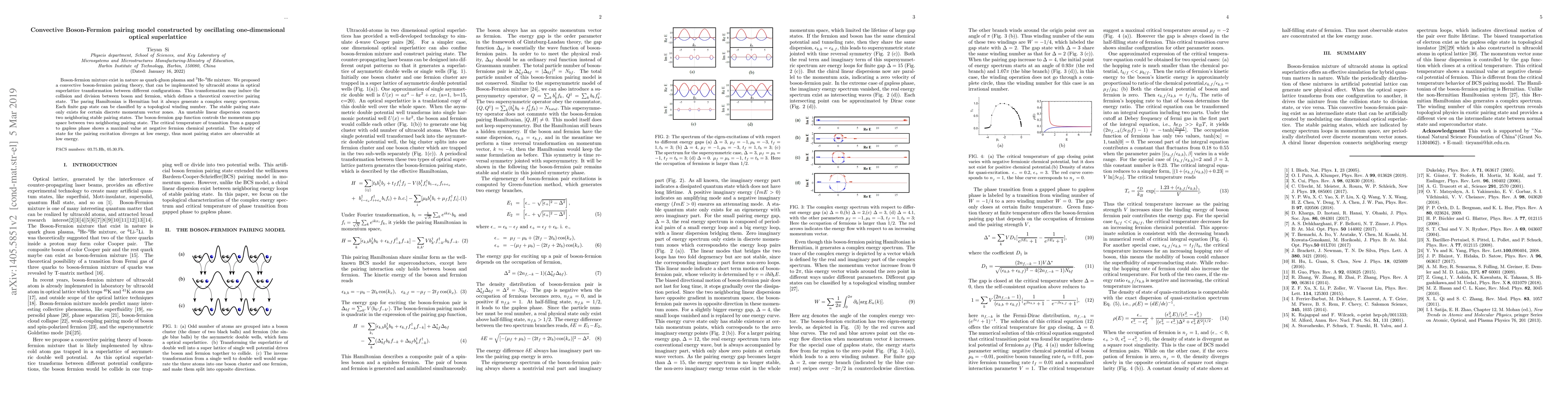 This paper proposes a convective boson-fermion pairing theory implemented via ultracold atoms in oscillating one-dimensional optical superlattices, leading to a complex energy spectrum with topological winding numbers. The stable pairing states exist in discrete momentum zones, with observable pairing excitations at low energy.
