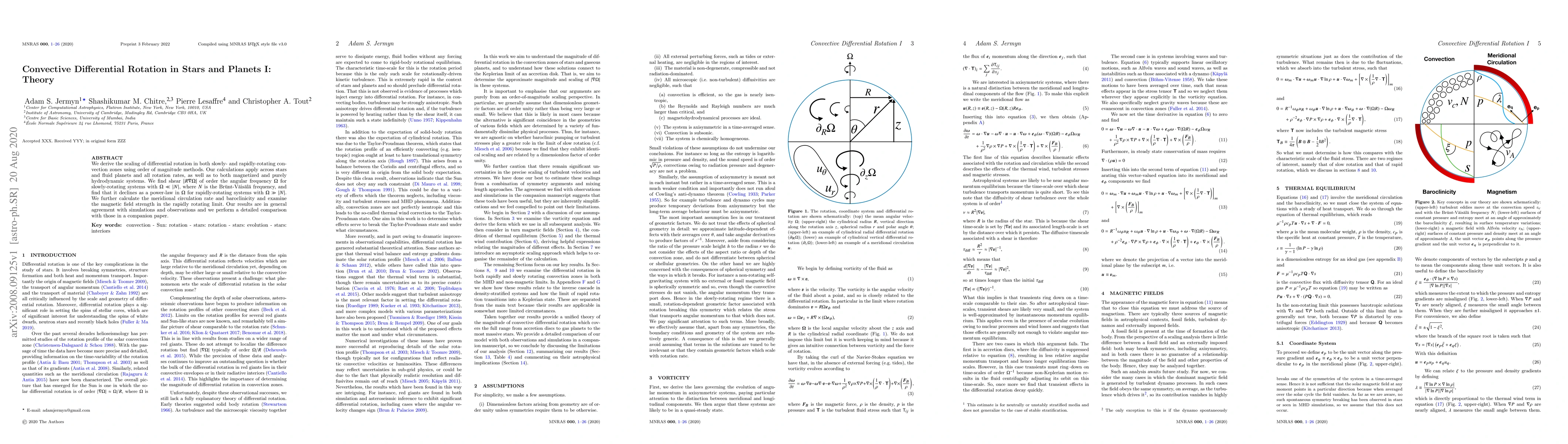 We derive the scaling of differential rotation in both slowly- and rapidly-rotating convection zones using order of magnitude methods. Our calculations apply across stars and fluid planets and all rotation rates, as well as to both magnetized and purely hydrodynamic systems. We find shear $|R\nabla\Omega|$ of order the angular frequency $\Omega$ for slowly-rotating systems with $\Omega \ll |N|$, where $N$ is the \brvs\ frequency, and find that it declines as a power-law in $\Omega$ for rapidly-rotating systems with $\Omega \gg |N|$. We further calculate the meridional circulation rate and baroclinicity and examine the magnetic field strength in the rapidly rotating limit. Our results are in general agreement with simulations and observations and we perform a detailed comparison with those in a companion paper.