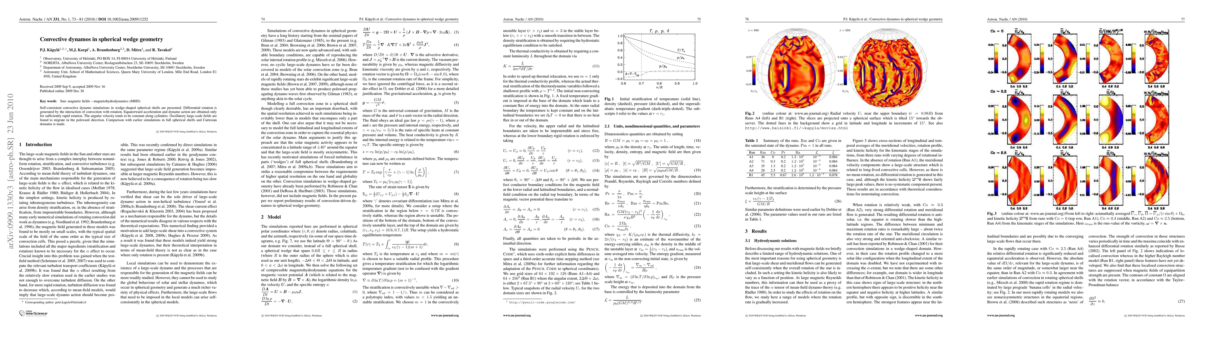 Self-consistent convective dynamo simulations in wedge-shaped spherical shells are presented. Differential rotation is generated by the interaction of convection with rotation. Equatorward acceleration and dynamo action are obtained only for sufficiently rapid rotation. The angular velocity tends to be constant along cylinders. Oscillatory large-scale fields are found to migrate in the poleward direction. Comparison with earlier simulations in full spherical shells and Cartesian domains is made.